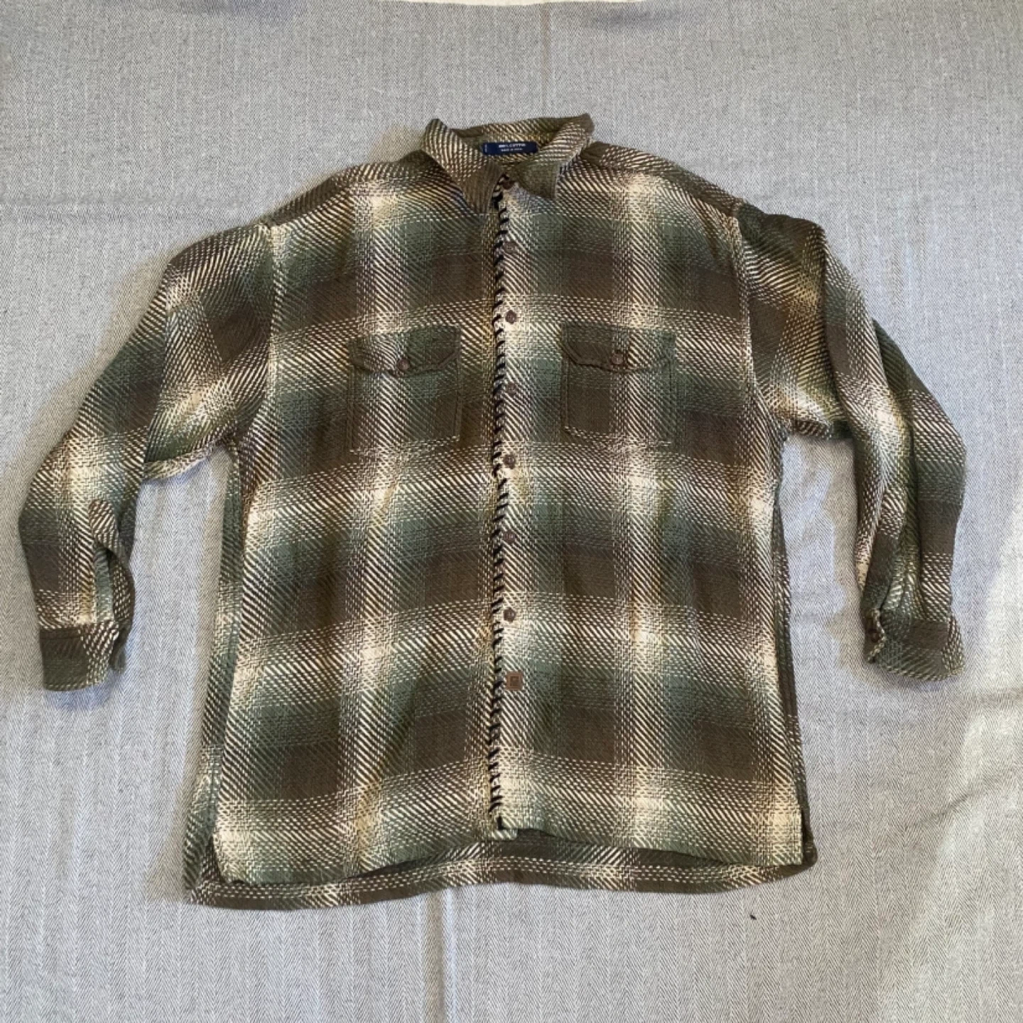 This is a vintage Chaps Ralph Lauren plaid flannel shirt in size XL. It's made from 100% cotton. The shirt features a classic plaid pattern in green, brown, and cream tones with two chest pockets.