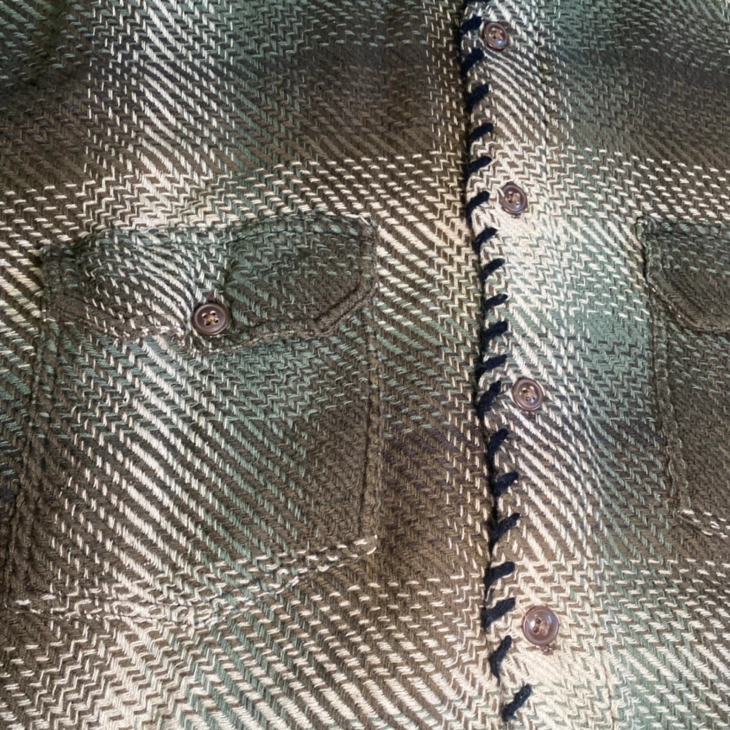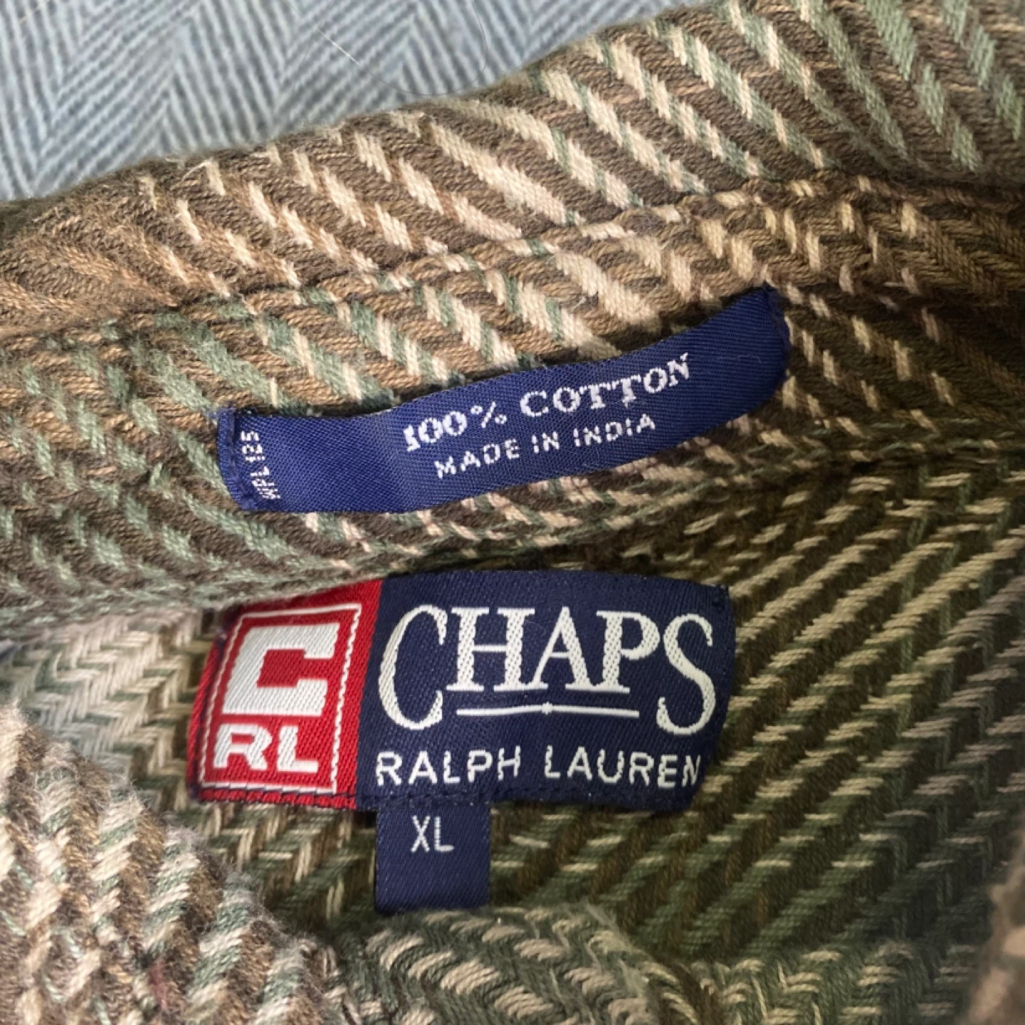 This is a vintage Chaps Ralph Lauren plaid flannel shirt in size XL. It's made from 100% cotton. The shirt features a classic plaid pattern in green, brown, and cream tones with two chest pockets.