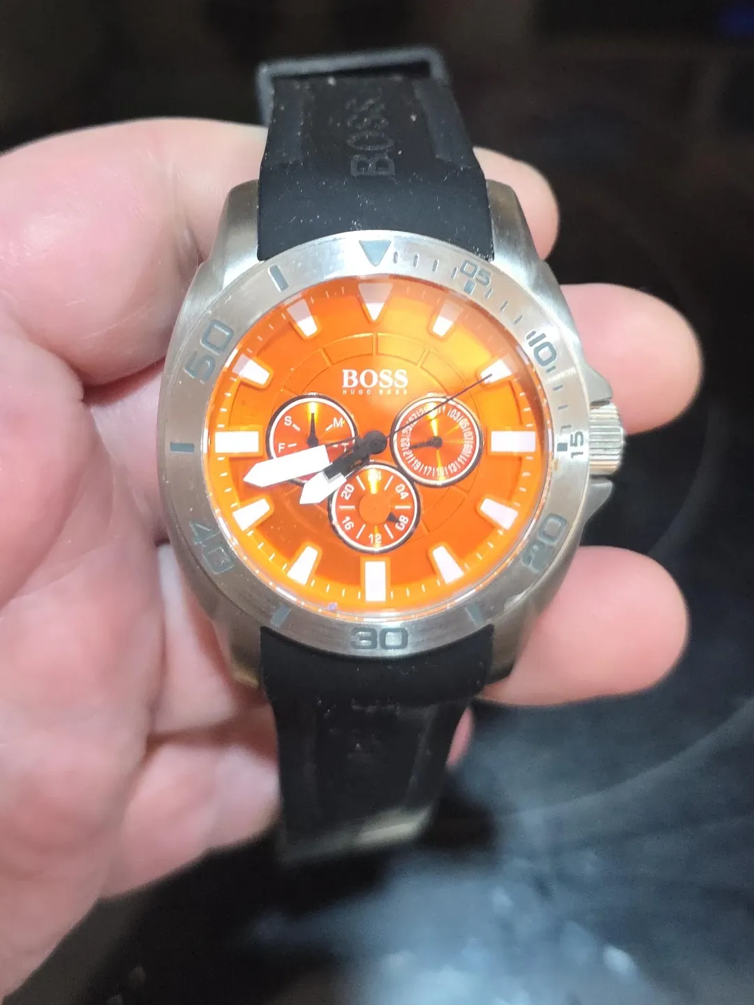 Buy & SellHugo Boss Orange Dial WatchHugo Boss Orange Dial Watch$135This is a Hugo Boss watch with an orange dial. It's water-resistant up to 3 ATM or 30 meters. Stainless steel casing with a black rubber strap.ConditionLike newBrandHugo BossWHERE TO MEET155 Fandango DrView MapSELLERverifiedCarlNW Brampton34623 reviews1 chats·0 favorites·18 viewsSEND CHAT TO SELLERHi Carl! I’m interested in your listing.Hi Carl! I’m interested in your listing.Get the Karrot app to chatSign In to chat
