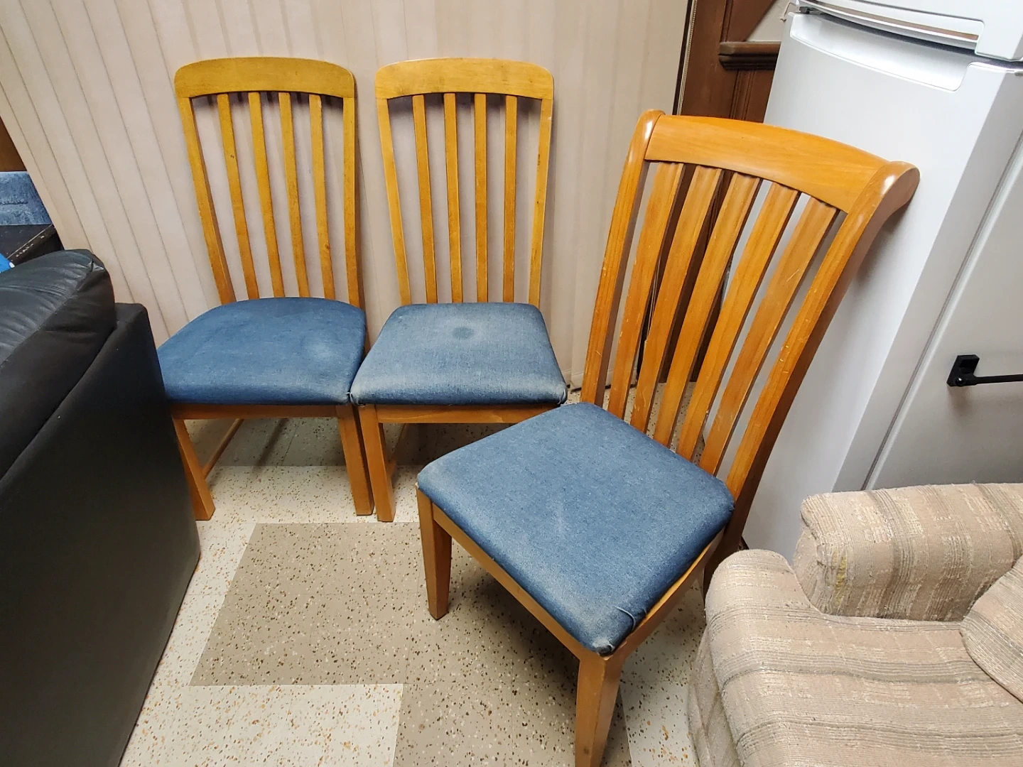 3 solid wood, high-backed chairs with denim fabric seats. 1 of the seats need to be reattached.