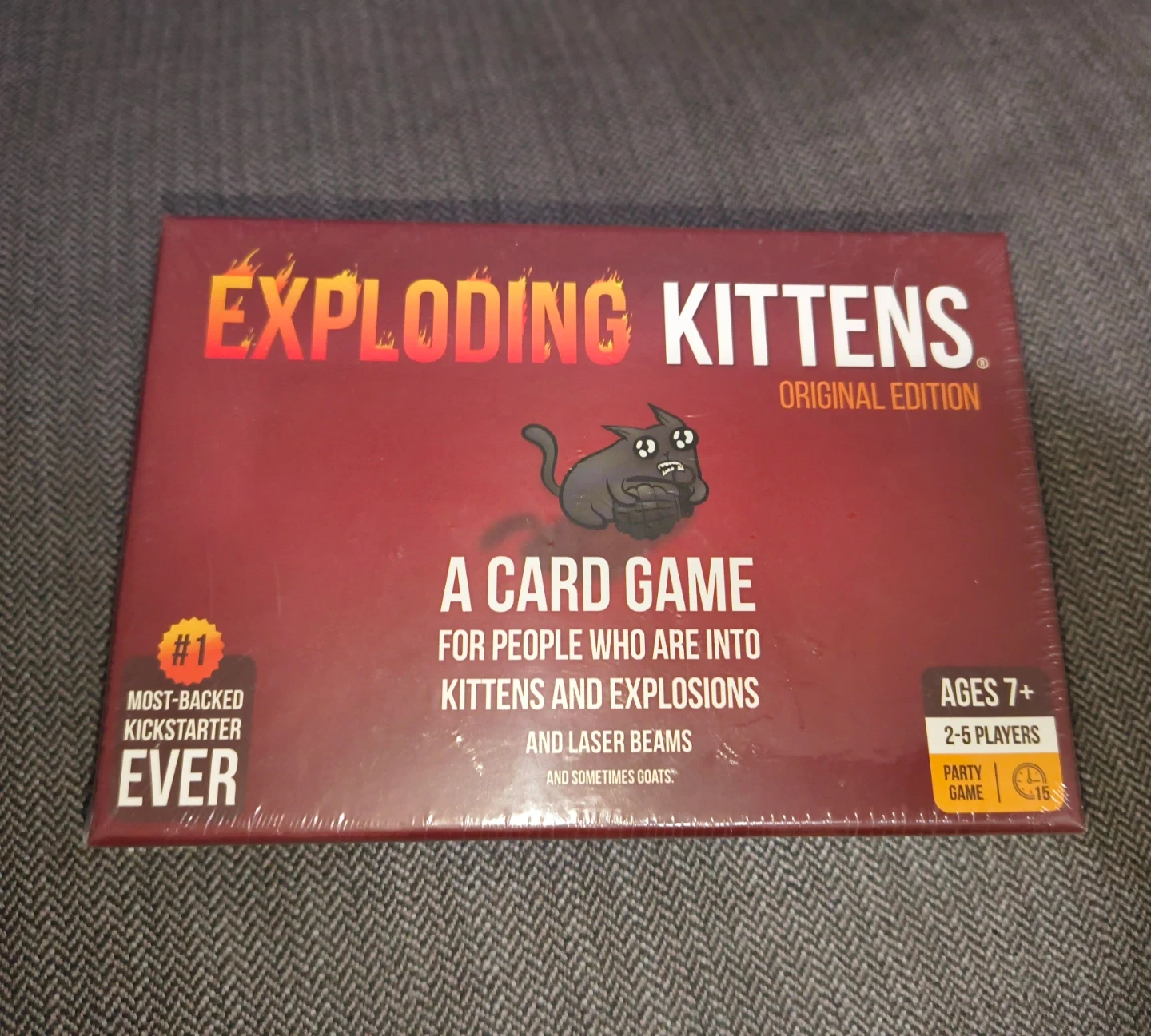 Exploding Kittens is a card game for people who are into kittens and explosions and laser beams and sometimes goats. It's for ages 7+ and supports 2-5 players.