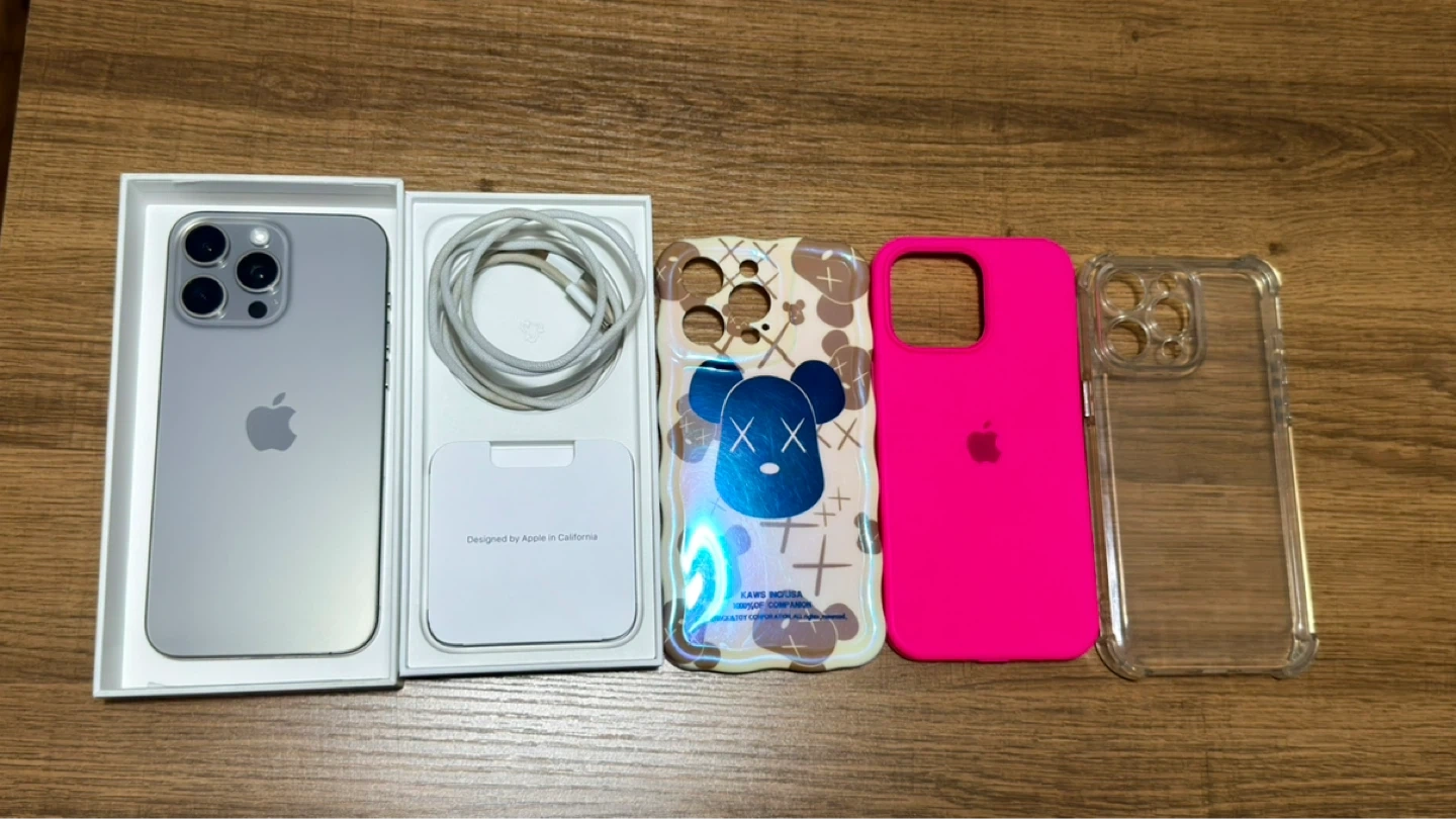 Includes phone with original box, USB-C charging cable, and three protective cases. One case is bright pink silicone with Apple logo, one is clear plastic, and one has a decorative-style bear design. Phone is factory unlocked, iCloud Clear, have glass screen protector, no scratches or dents.