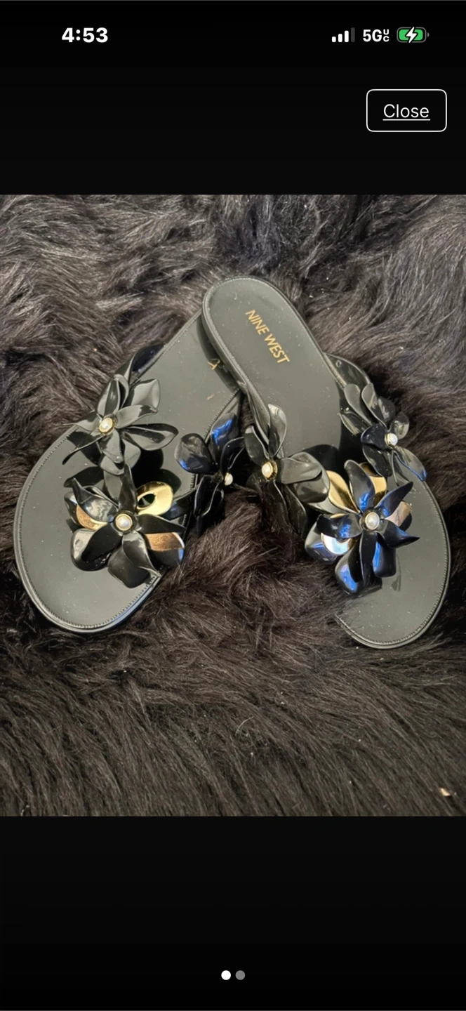These Nine West thong sandals are black with cute floral embellishments. They feature a comfortable flat sole and open-toe design. Perfect for warm weather outings!