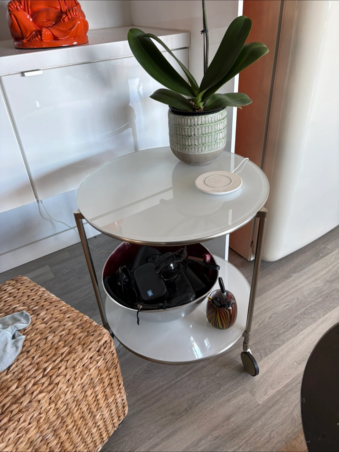 A handy two-tier round side table with a modern white finish and silver metal legs. It's got wheels for easy moving around your space! Perfect for keeping essentials like your phone or a plant within reach.