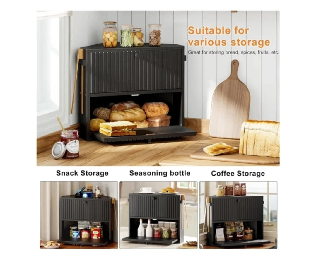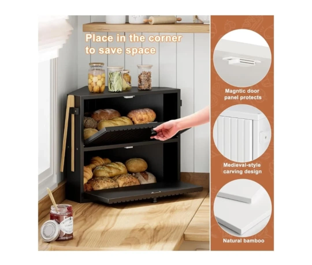 This corner bread box is perfect for storing bread, spices, fruits, and more. It's made from natural bamboo and features a magnetic door panel that protects its contents. The medieval-style carving design adds a touch of charm to your kitchen. Dimensions: 43.5" x 31.5" x 9.6".