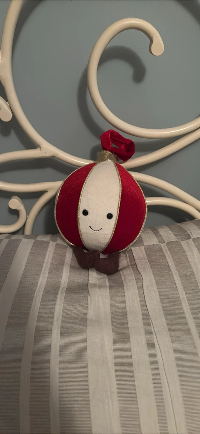 This is a Jellycat Bauble Buddy plush toy. It's a soft, festive decoration designed to look like a Christmas ornament. The toy is red and white with gold trim and has a cute smiling face. It's perfect for adding a whimsical touch to holiday decor or for gifting to someone special!