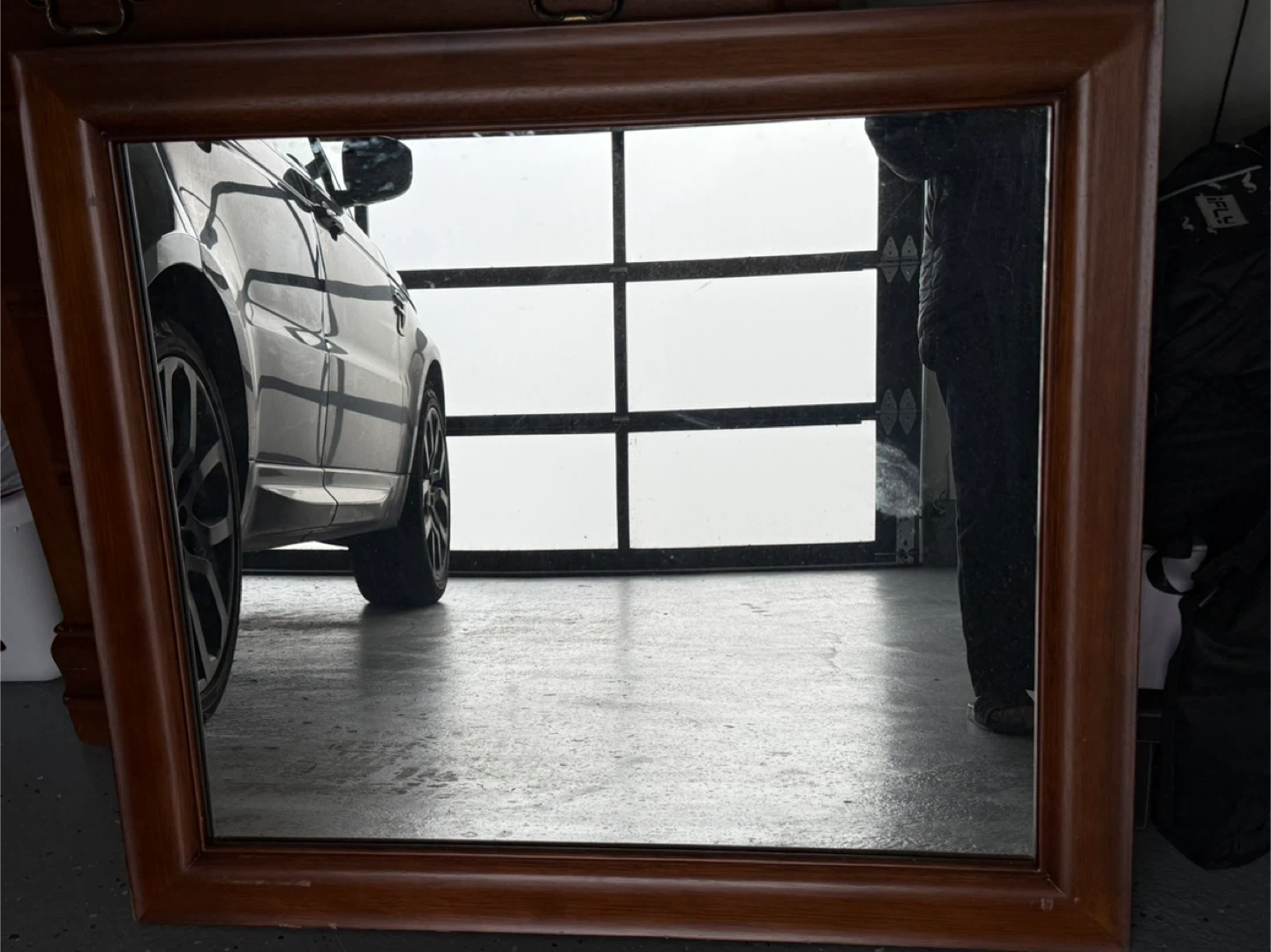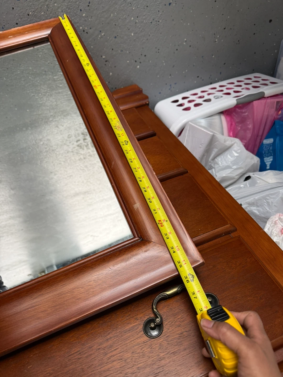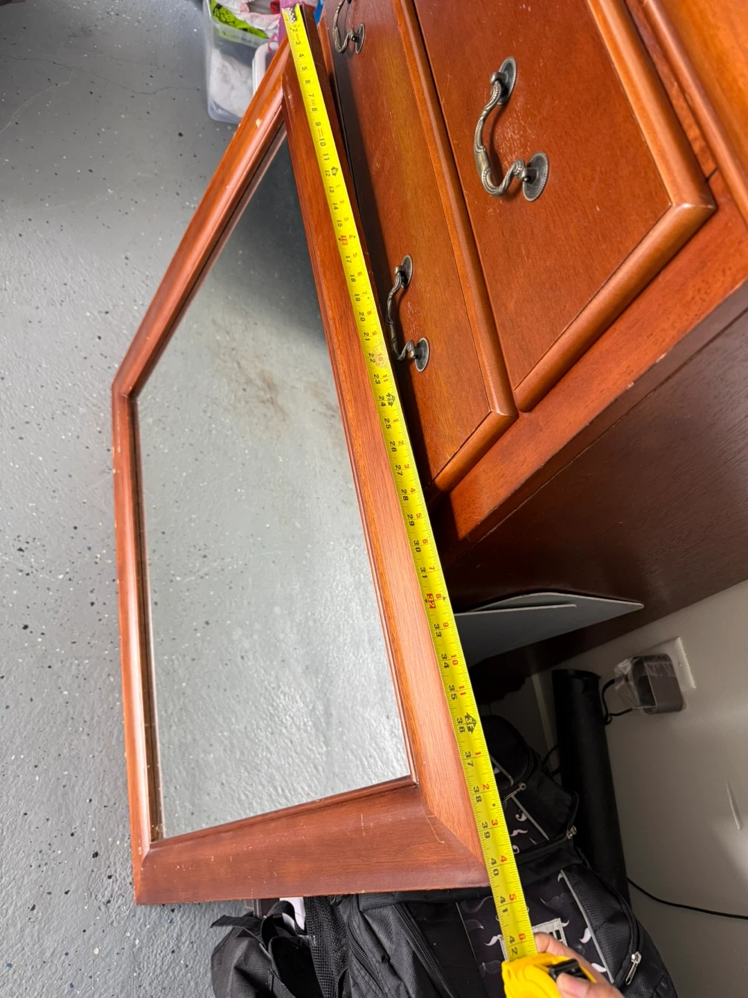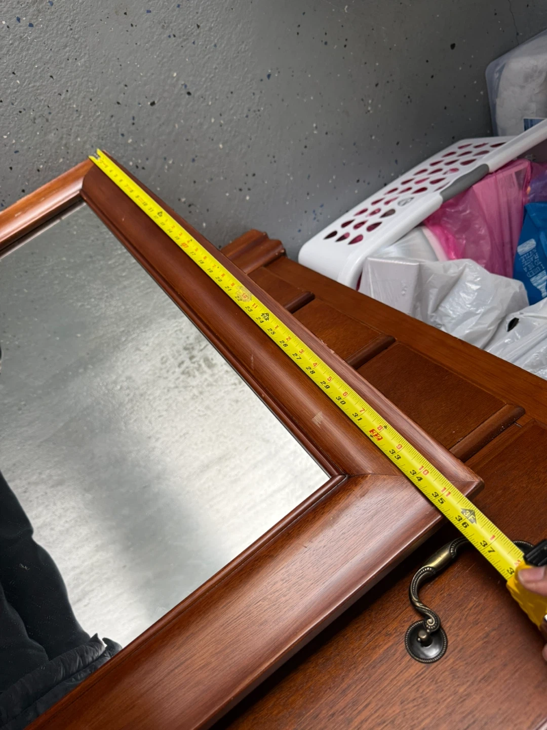 This is a wooden framed mirror. It measures approximately 37 inches wide and 25 inches tall. The frame is a rich brown wood tone.