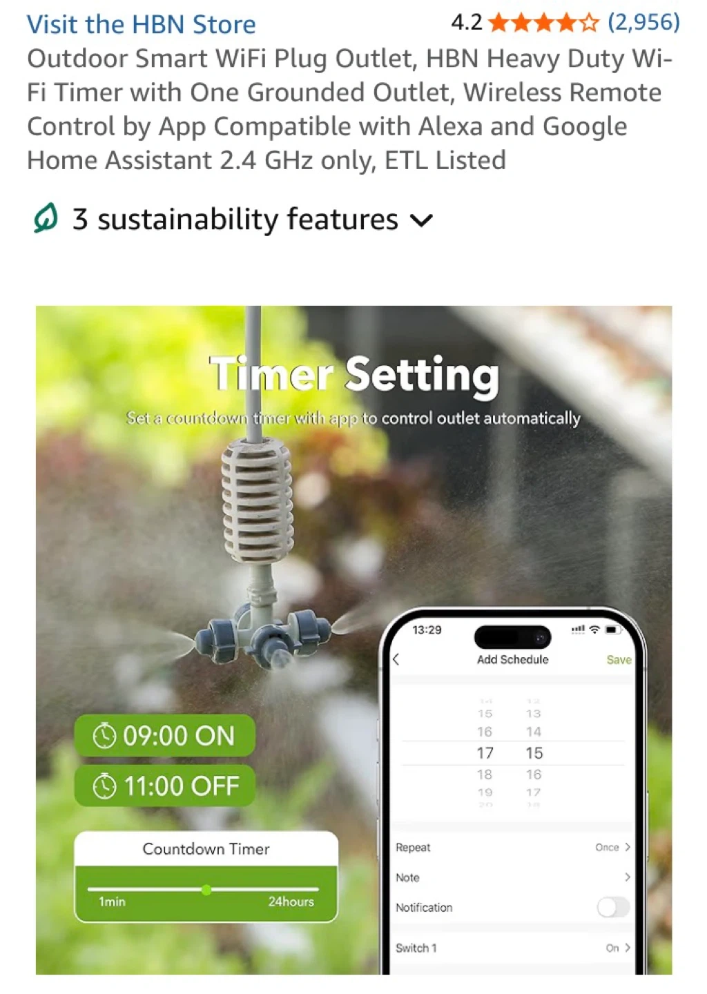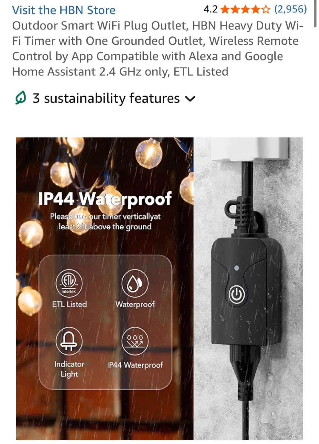 This is an HBN outdoor smart WiFi plug outlet with remote control via app and voice. It's IP44 waterproof and ETL listed. Works with Amazon Alexa and Google Assistant.
