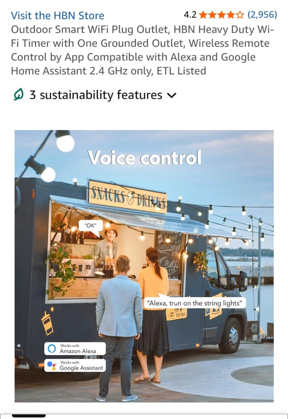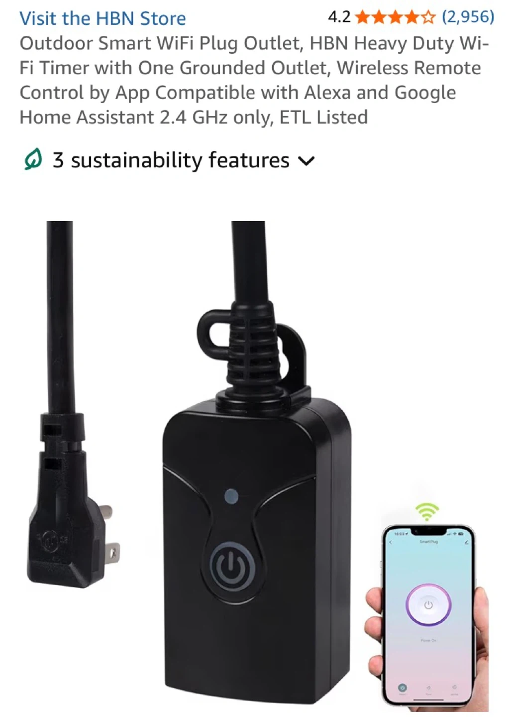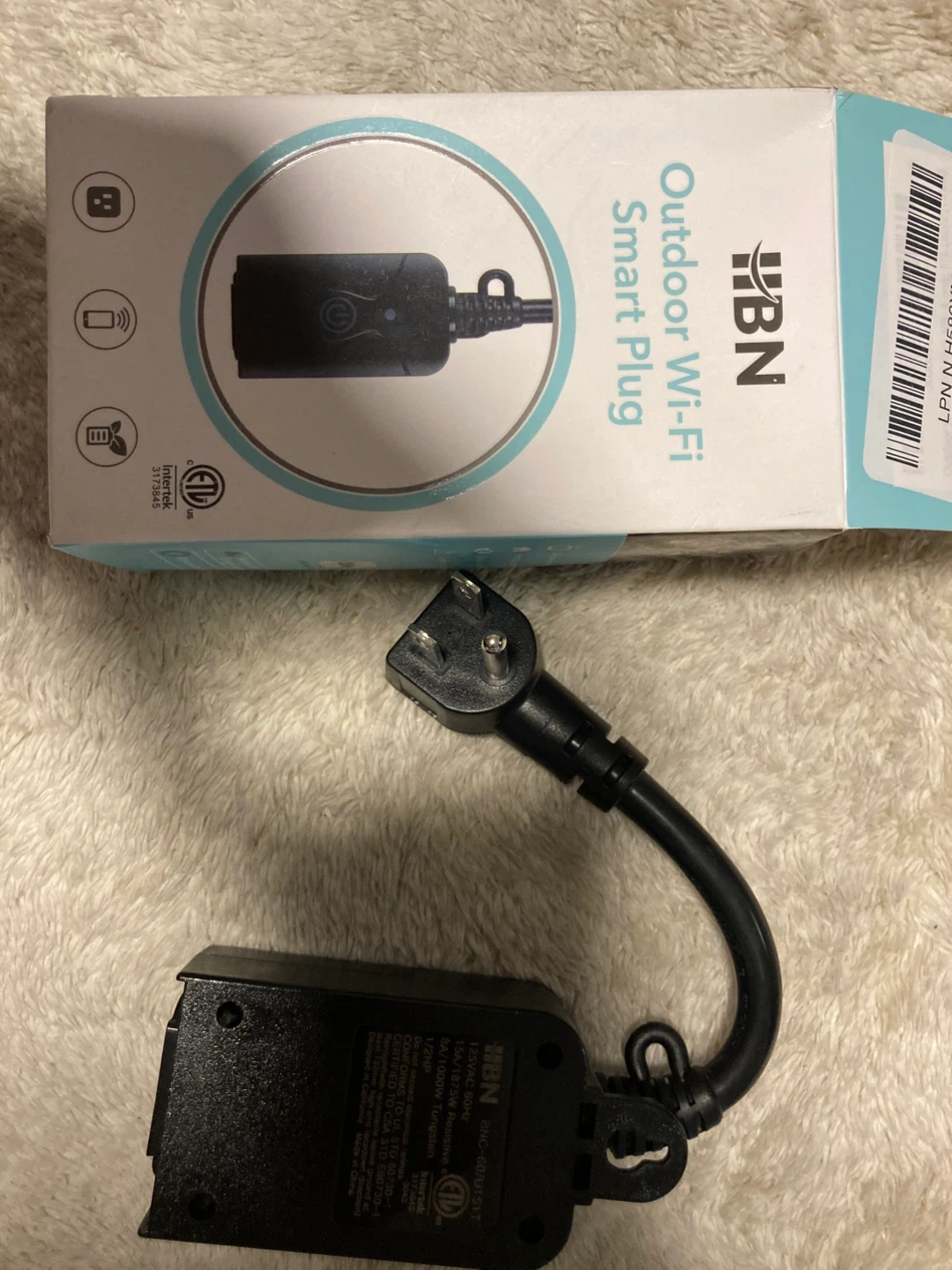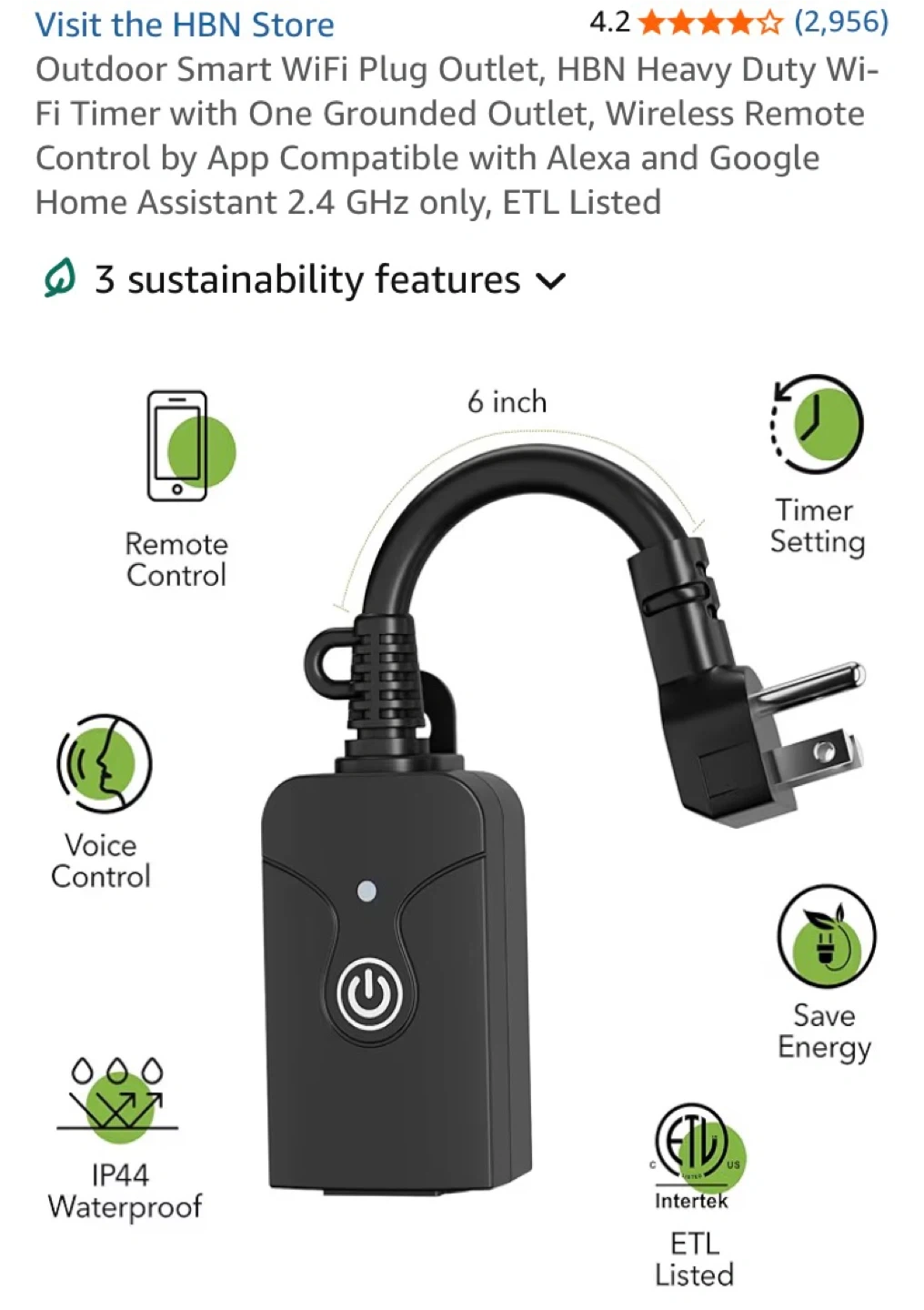 This is an HBN outdoor smart WiFi plug outlet with remote control via app and voice. It's IP44 waterproof and ETL listed. Works with Amazon Alexa and Google Assistant.