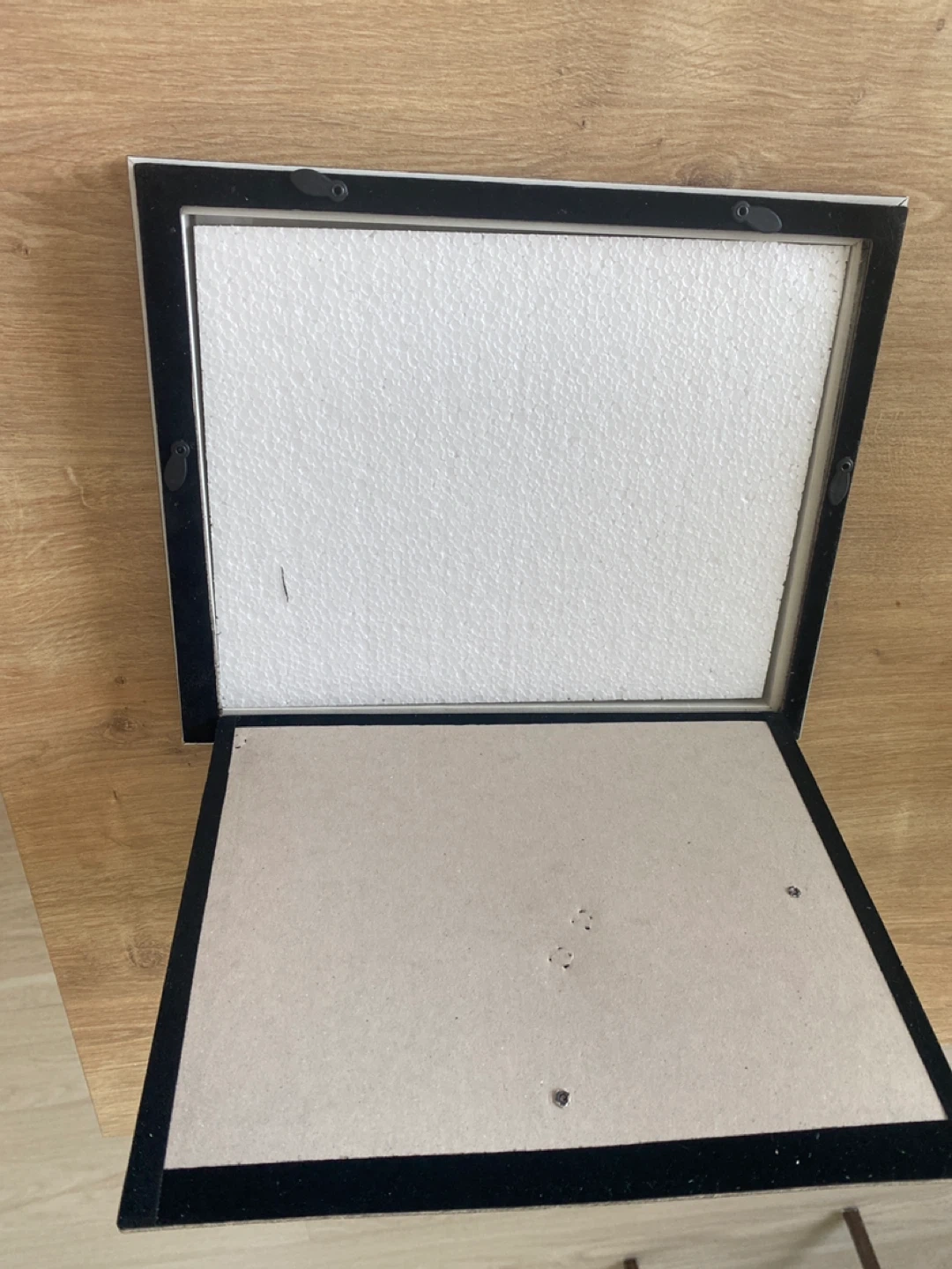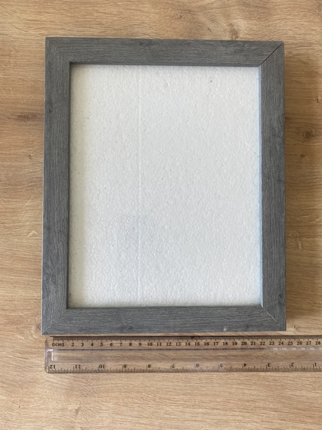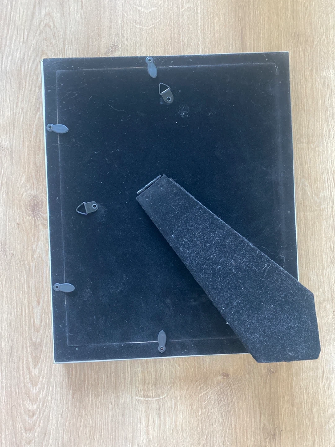 This is a grey wooden photo frame. It has a stand for tabletop display or can be hung on a wall.