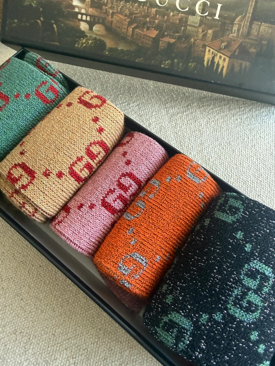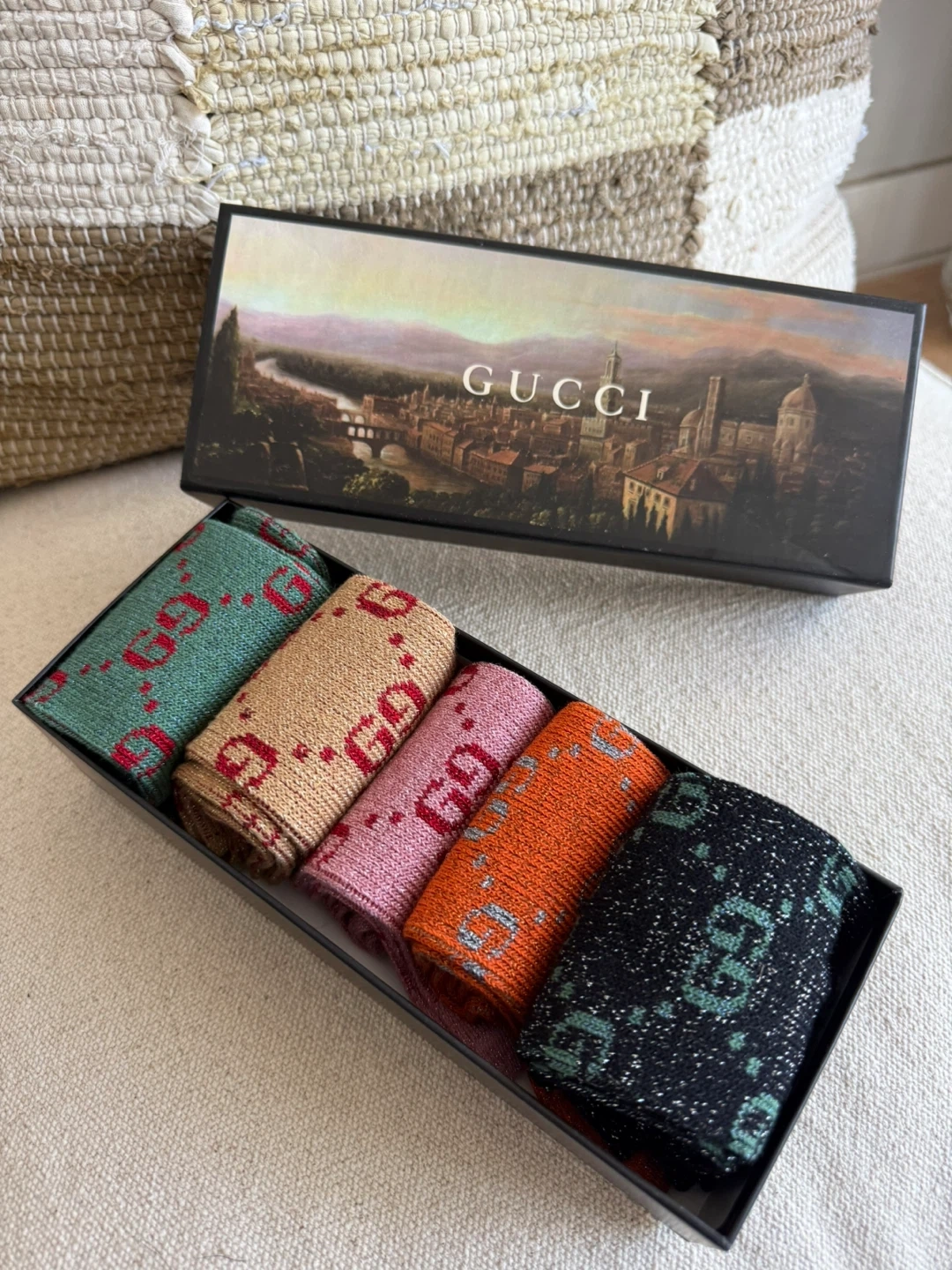This set includes five pairs of Gucci socks in various colours and patterns, crafted from a comfortable material with a touch of a glitter thread pattern