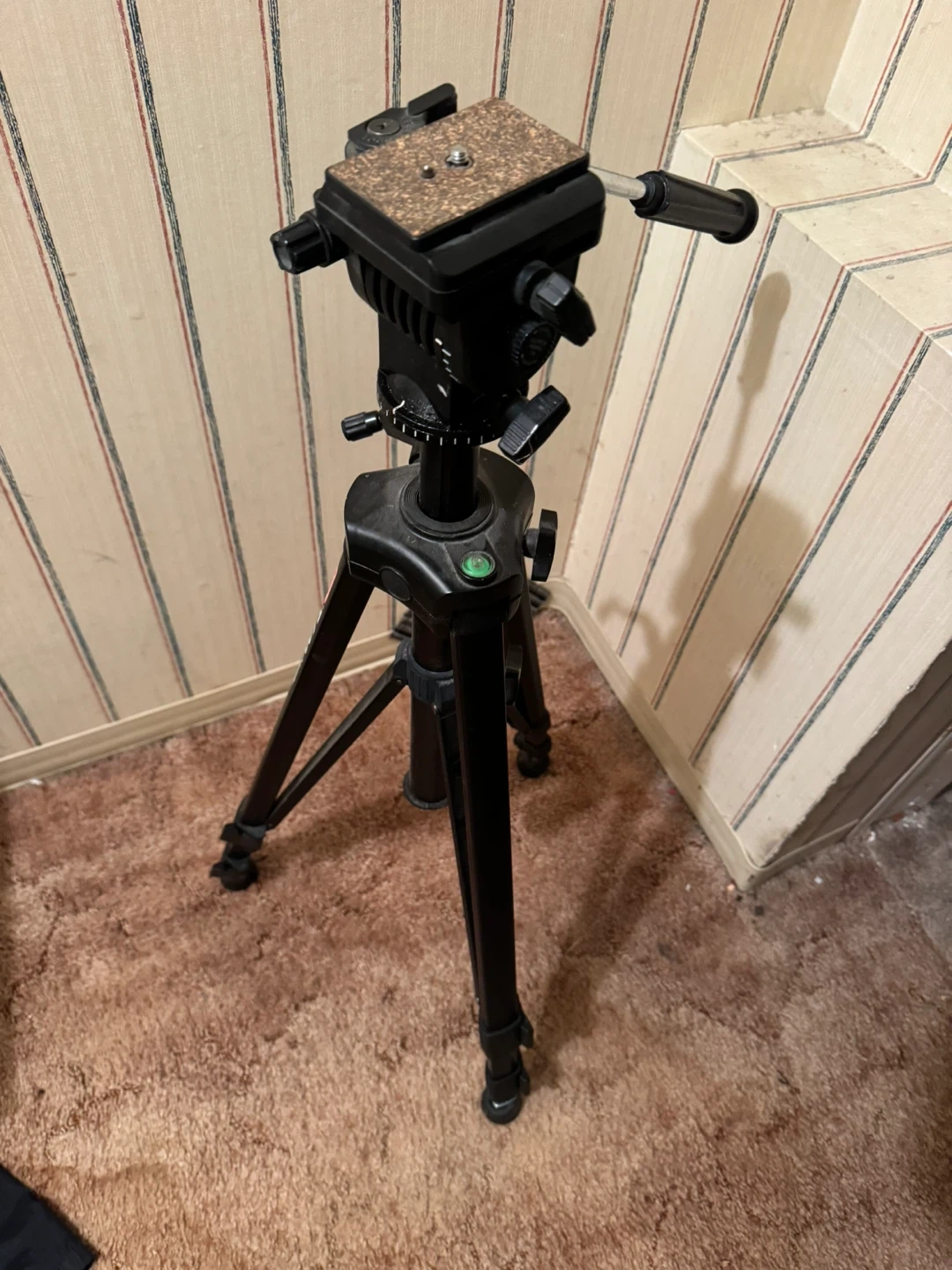 This is an Optix T-600 OptiFLOW fluid head tripod. It's black and made of metal and plastic. This tripod is great for stable camera shots!