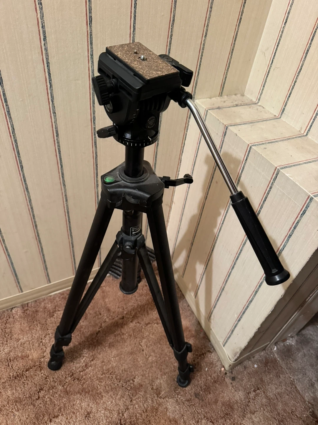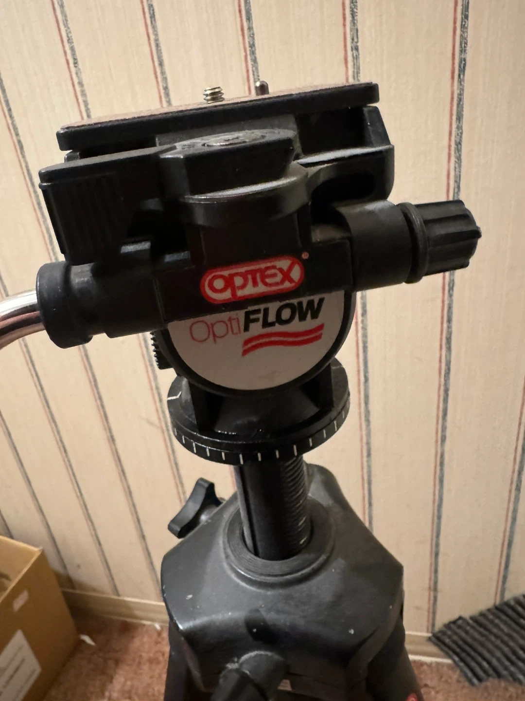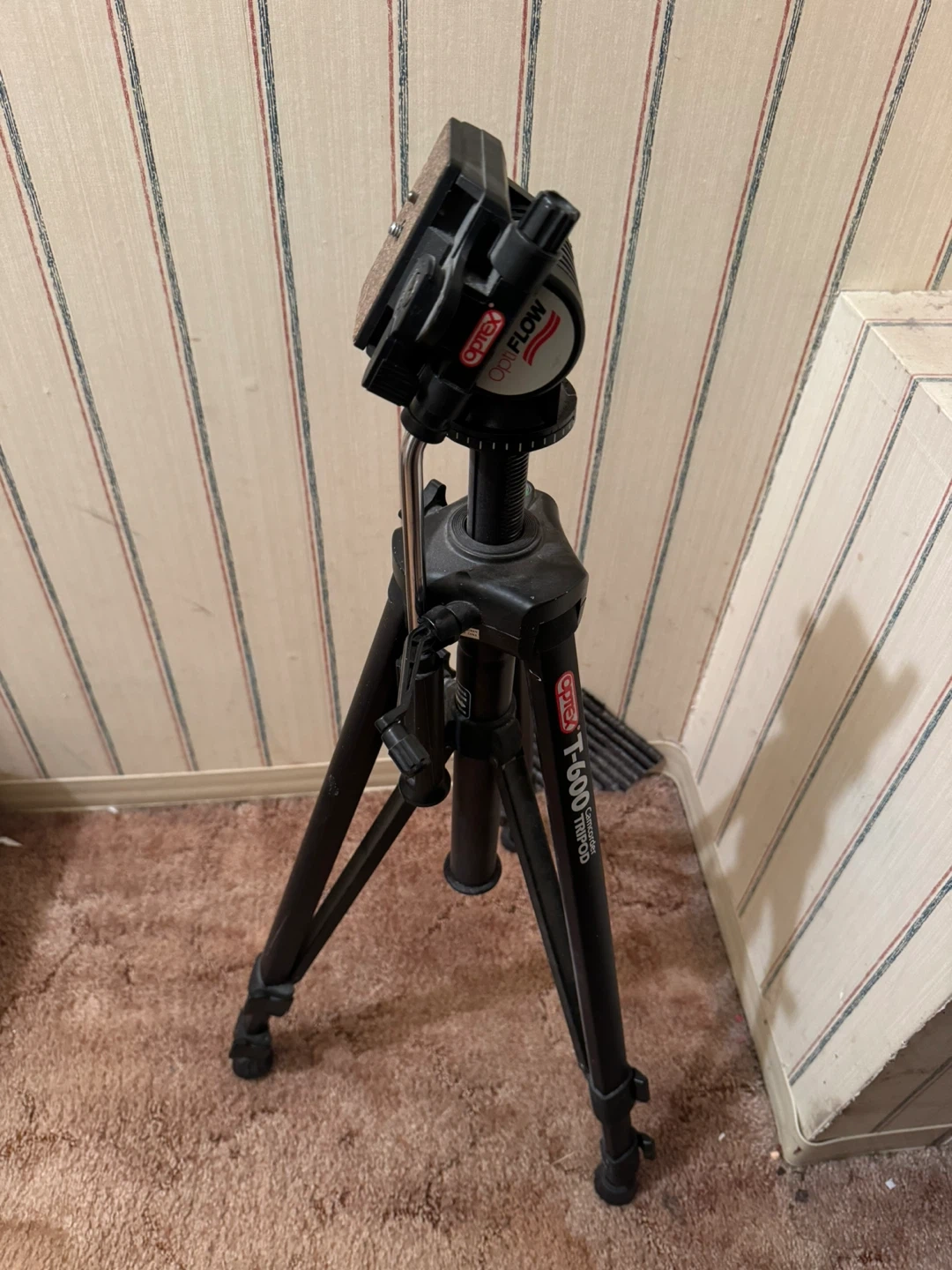 This is an Optix T-600 OptiFLOW fluid head tripod. It's black and made of metal and plastic. This tripod is great for stable camera shots!