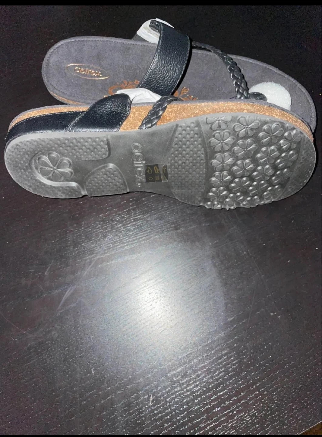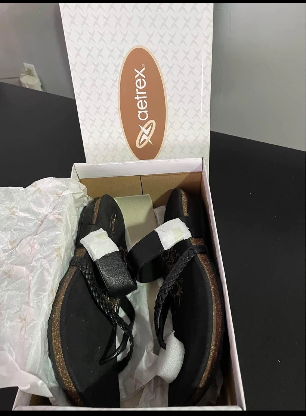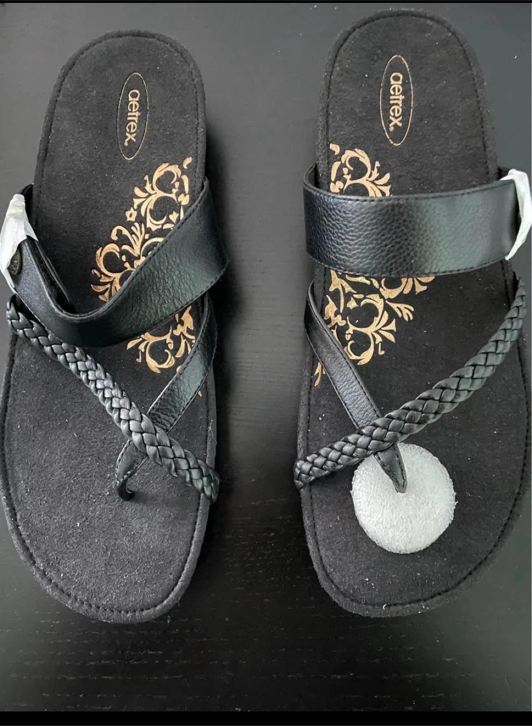 These Aetrex sandals are brand new and ready for summer! They feature a stylish braided design and comfortable leather straps. The box is included!
