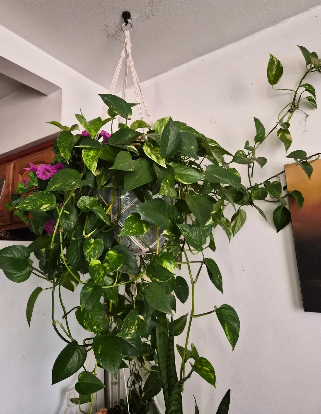 Beautiful, lush green Pothos plant in a macrame hanger. It's a vining plant with variegated leaves and comes with a decorative macrame holder. The plant is healthy and ready to brighten up any space!