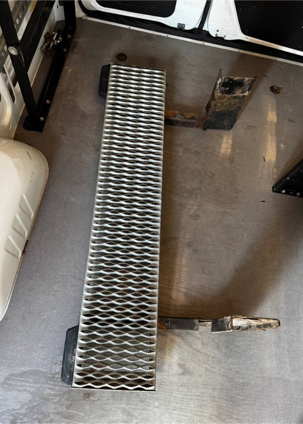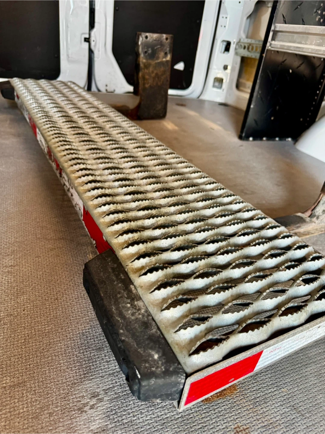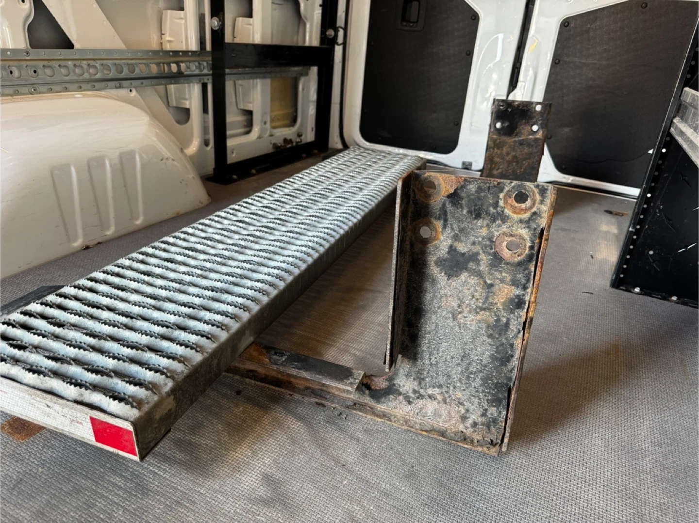 This is a retractable step designed for van entry. It's made of sturdy metal with a non-slip tread surface. This step would be useful for improving accessibility in commercial or personal vans. It's designed for easy retraction and deployment.