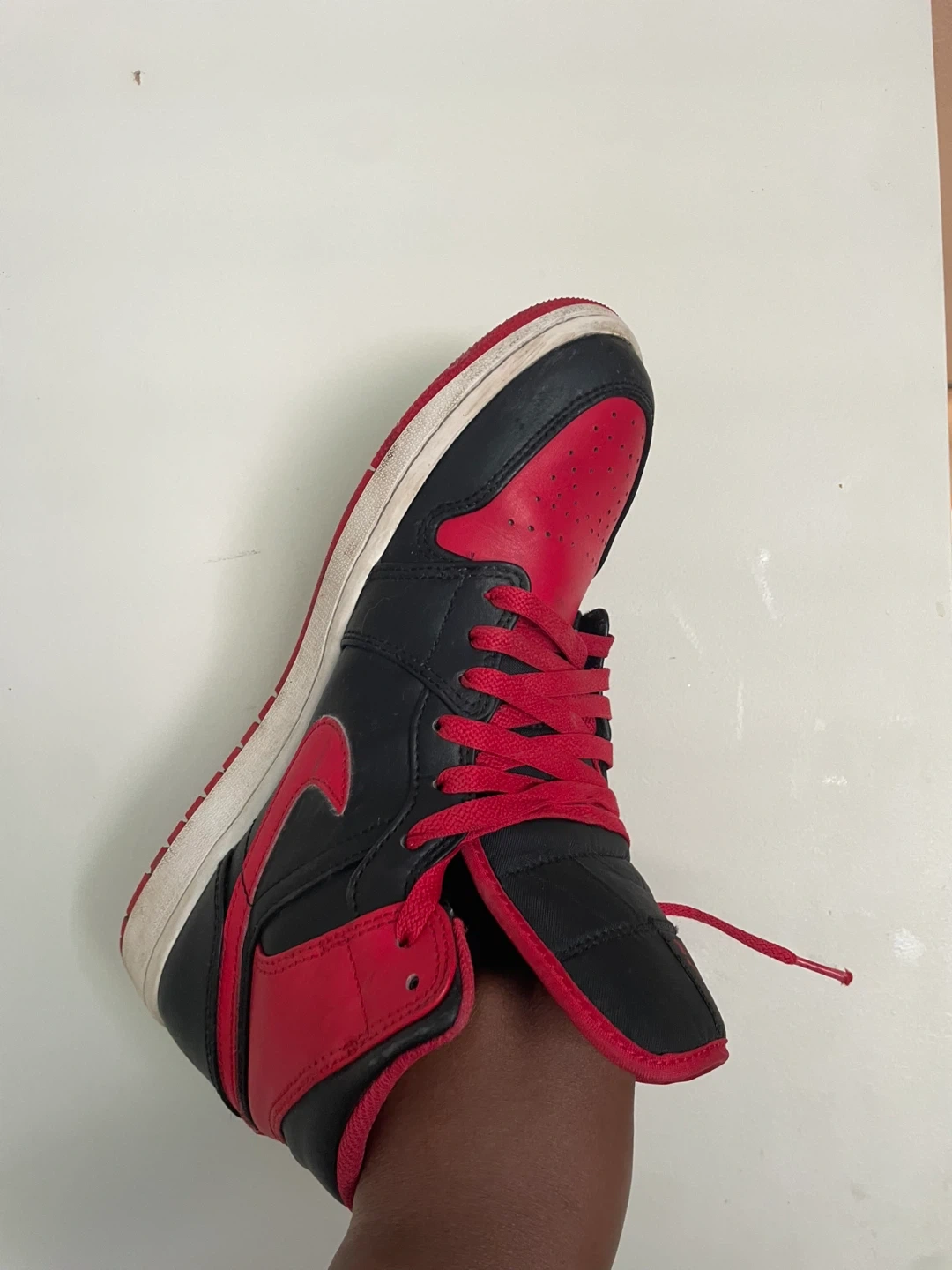 Classic high-top sneakers featuring a black and red colourway. Features leather and synthetic materials. Includes laces and Air cushioning. Good for everyday wear.