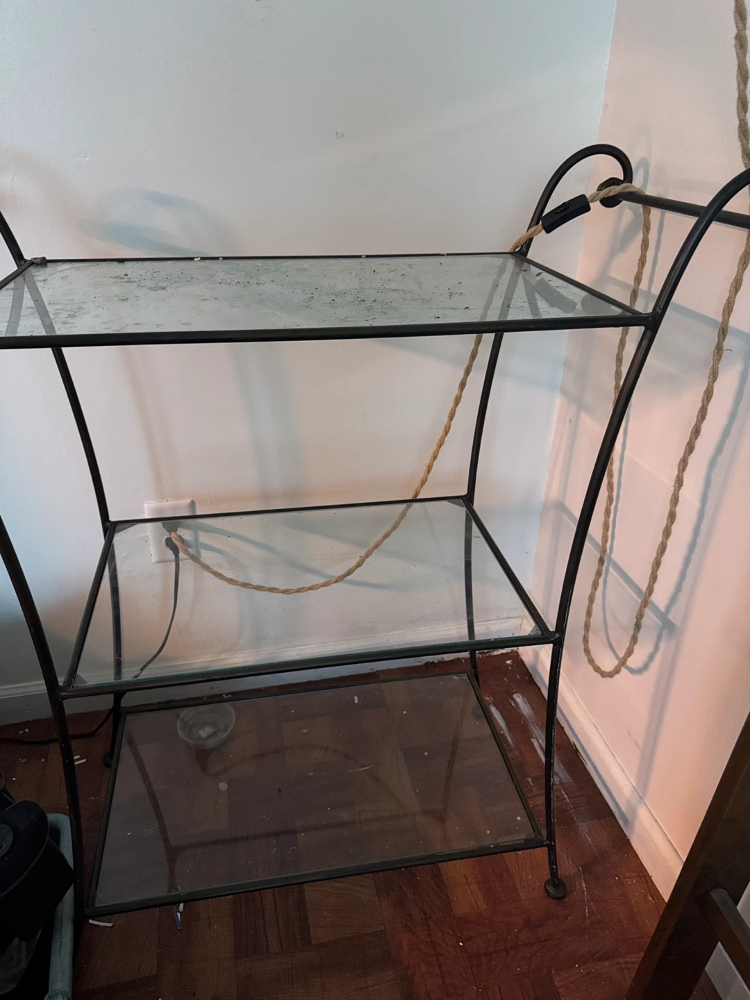This is a 3-tier shelf unit with a metal frame and glass shelves. It's a versatile piece for storage or display. The frame has decorative scrollwork. Shelves are made of clear glass.
