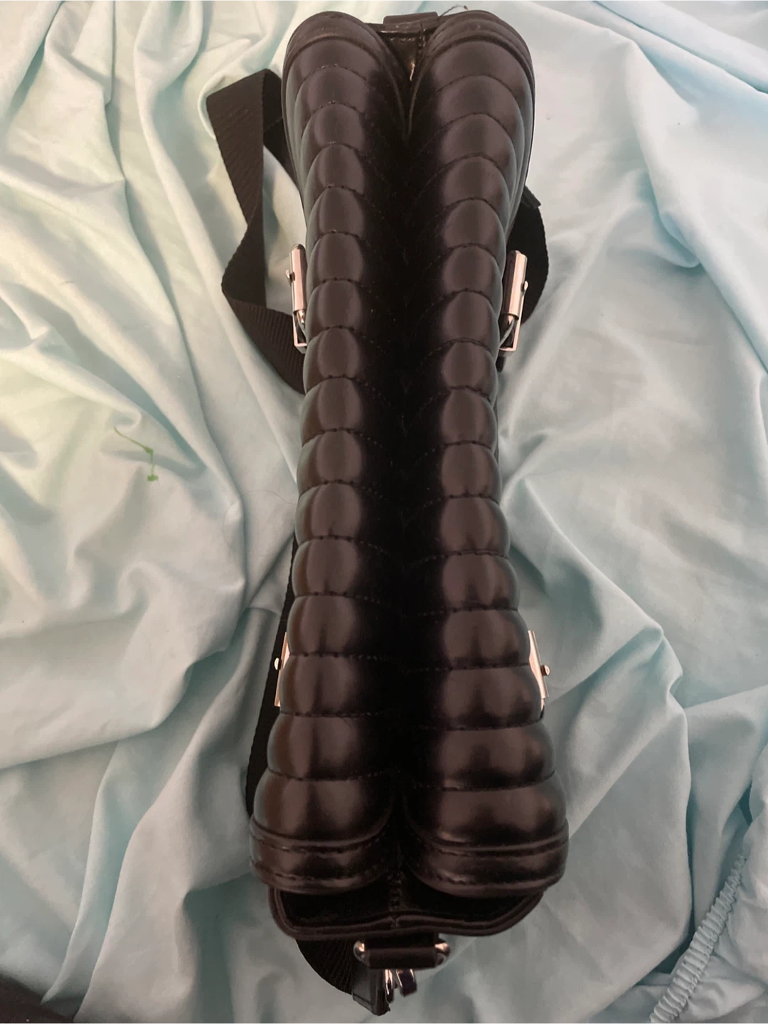 This black shoulder bag features a stylish quilted design with two buckle closures. It's made of faux leather and includes an adjustable strap. The interior has a simple lining with a divider.