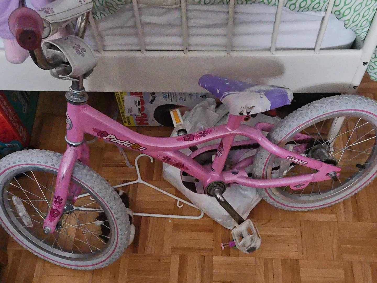 This is a pink kids' bicycle with "Pudda" branding and a "Giant" logo on the frame. It has a purple seat with white stars and character accents. The bike features white tires with pink trim and decorative flowers on the frame and front fork.