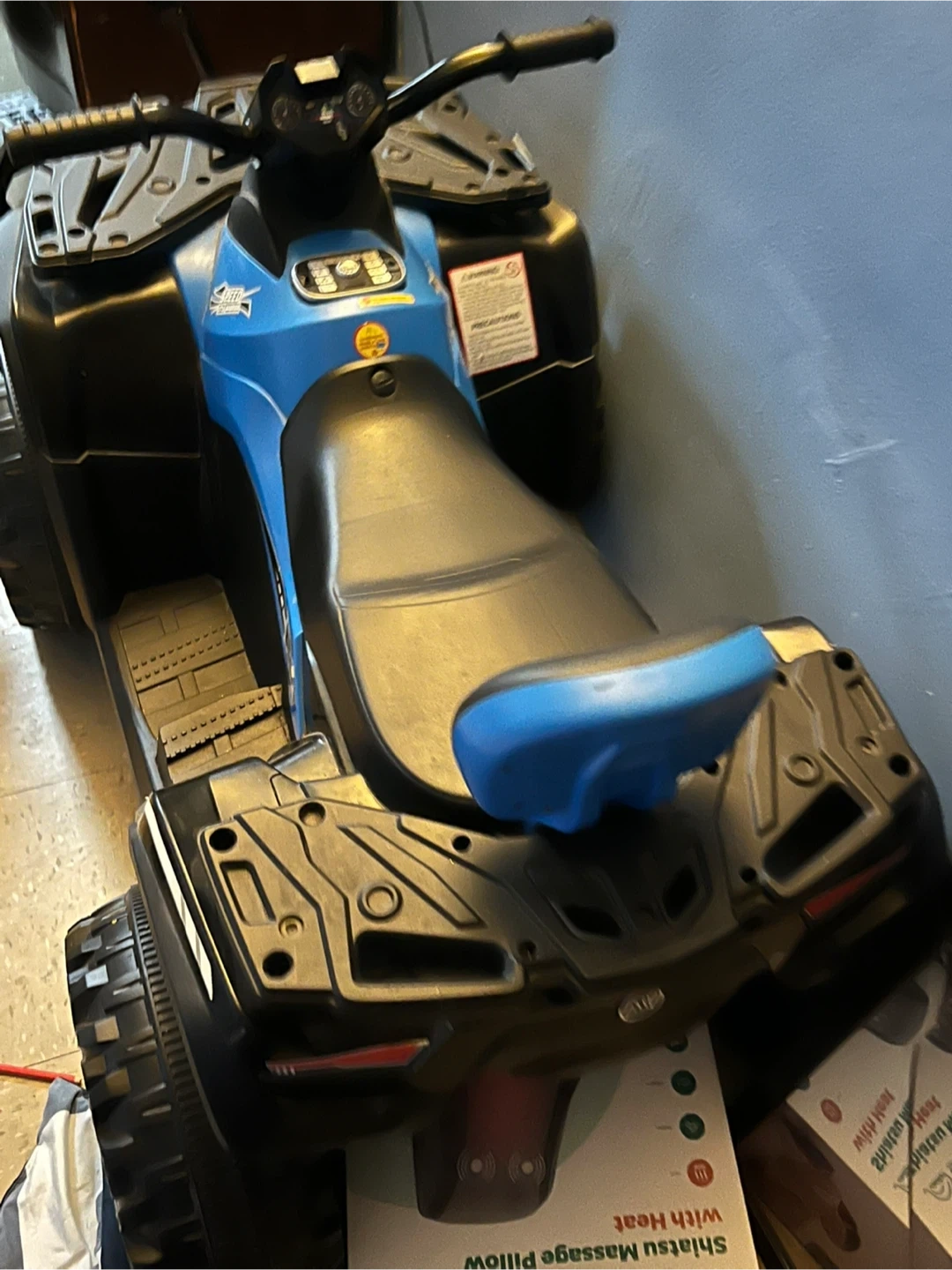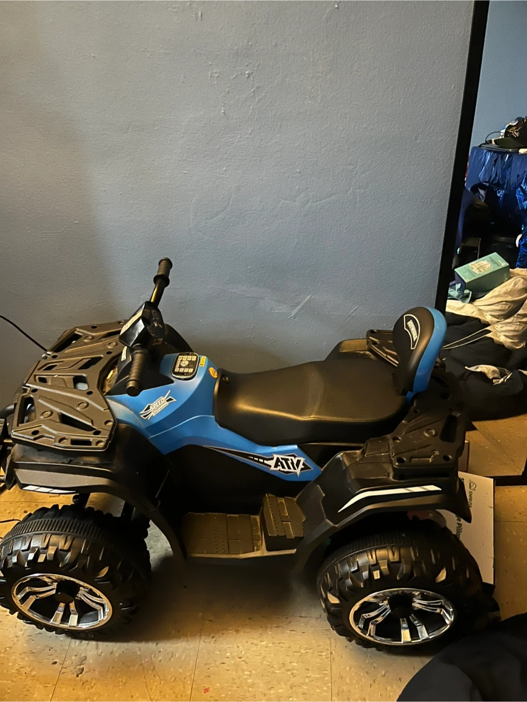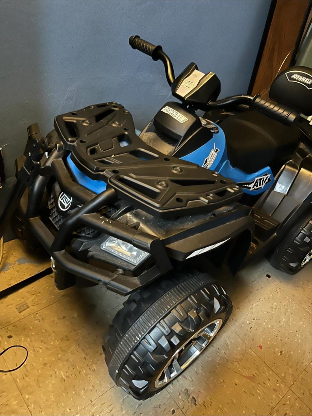 This is a blue ride-on ATV for kids. It has a sturdy build with durable wheels. Only been used 2 times and it comes with charger!