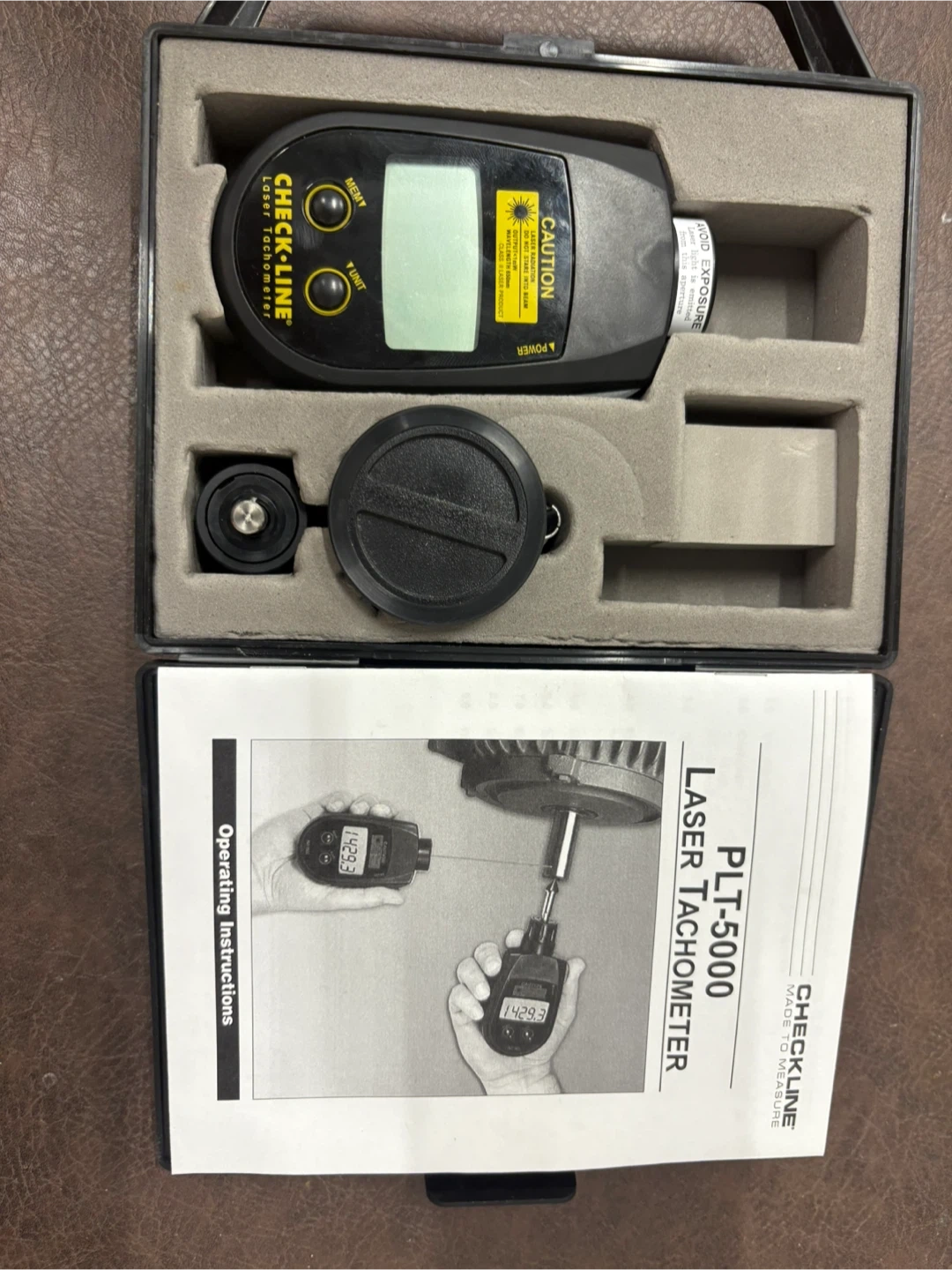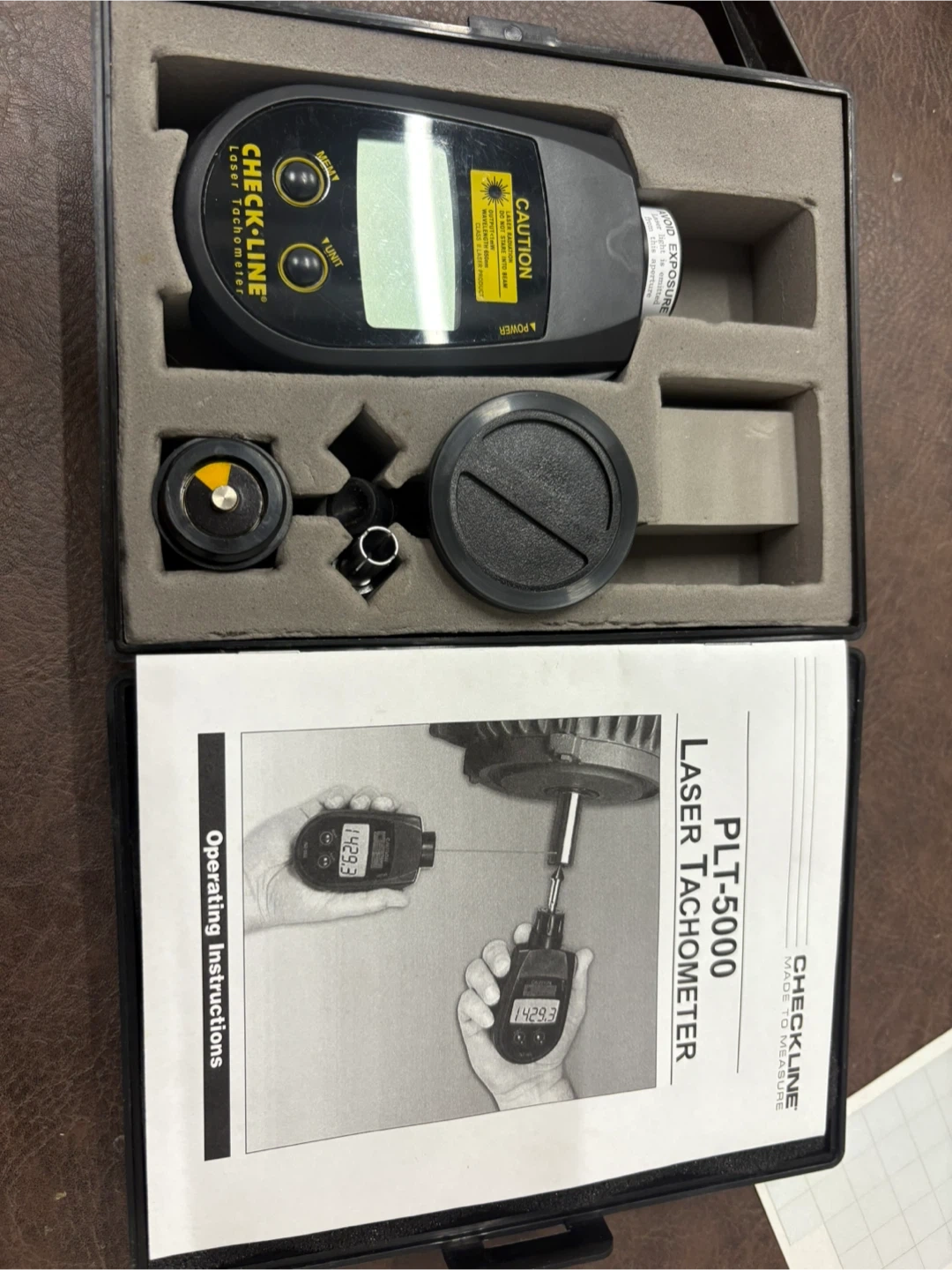 CHECK-LINE PLT-5000 Laser Tachometer. Includes operating instructions and accessories in a protective case. Measures RPM using laser detection.