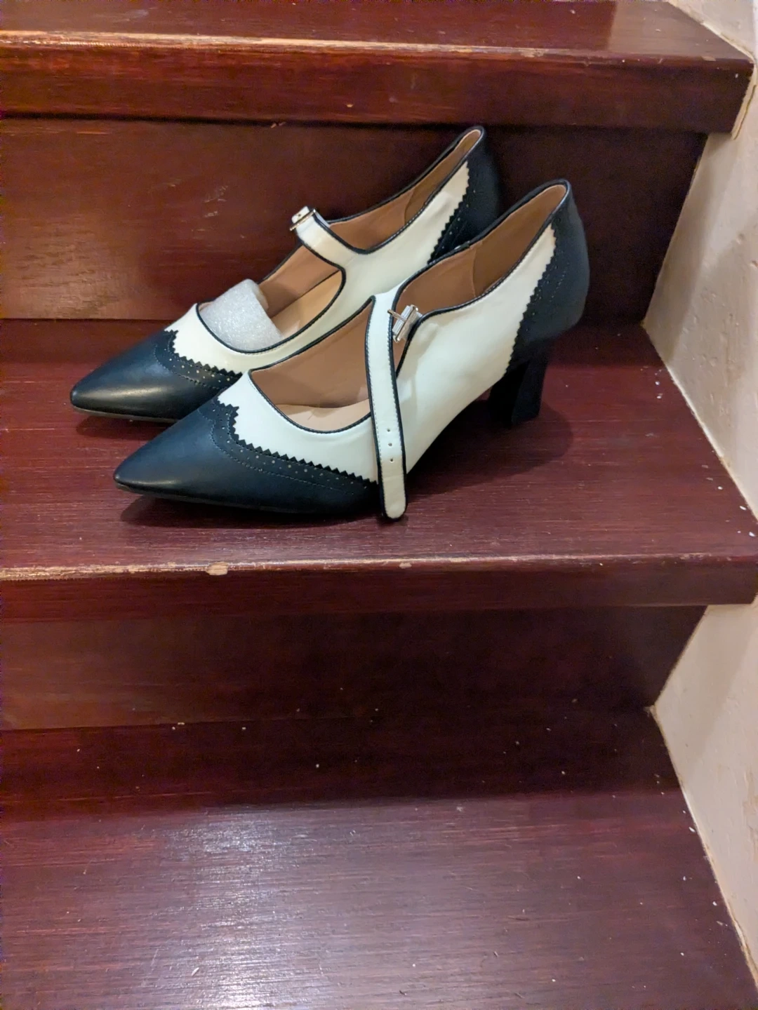 Chic women's Mary Jane style heels in a classic black and white colourway. These shoes feature a secure strap and a stylish block heel. A great choice for adding a touch of vintage flair to your outfit!