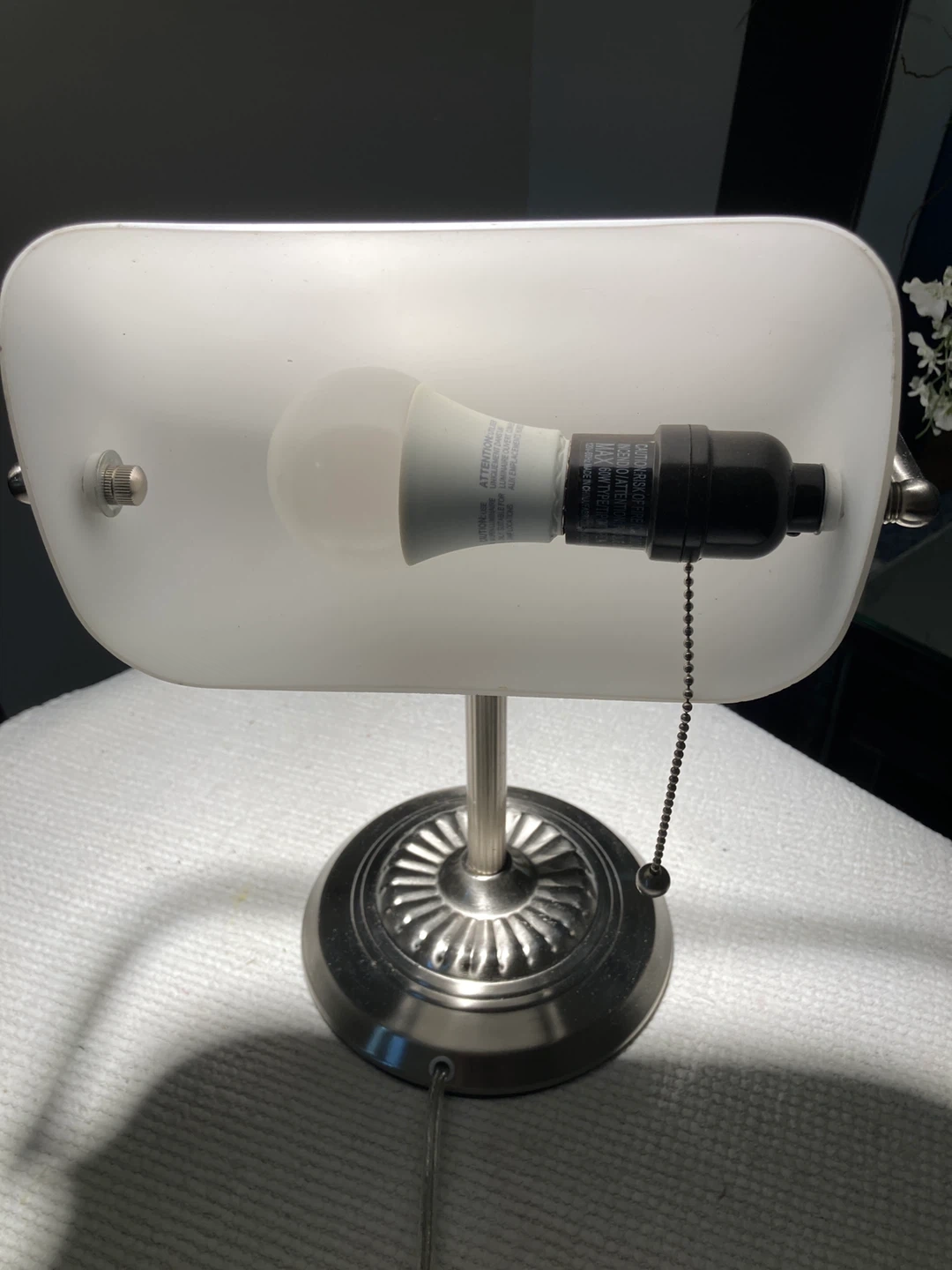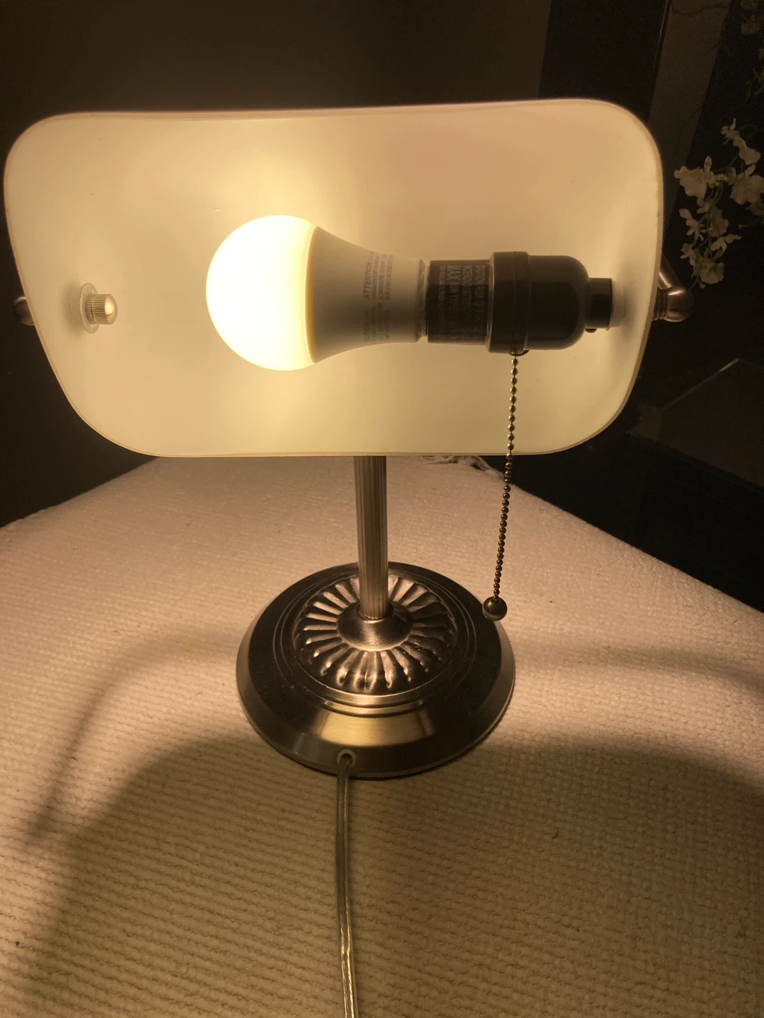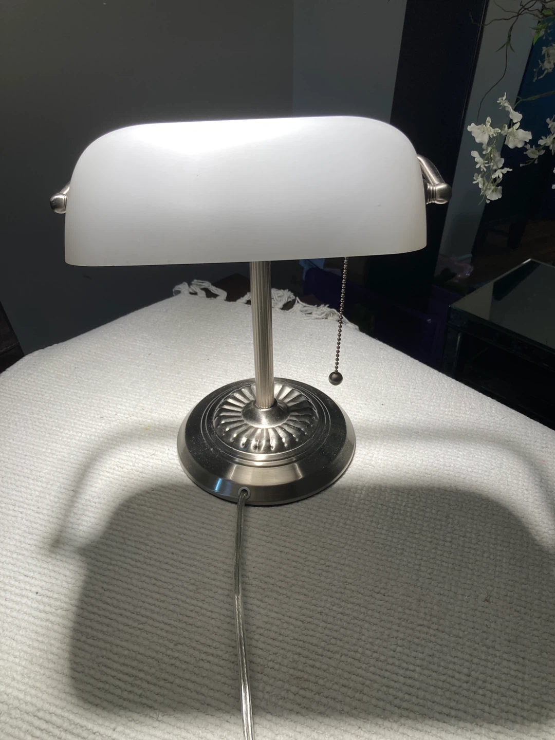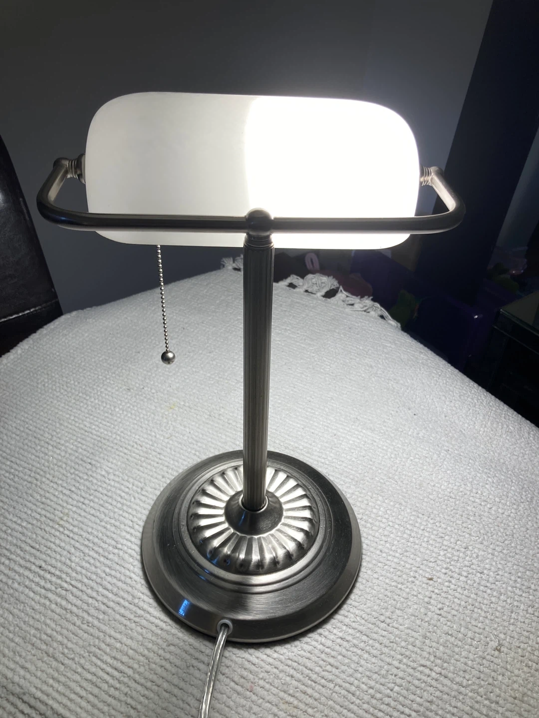 This is a banker's style desk lamp with a frosted glass shade. It has a brushed nickel finish and a pull chain for easy operation. Perfect for illuminating your workspace or bedside table.