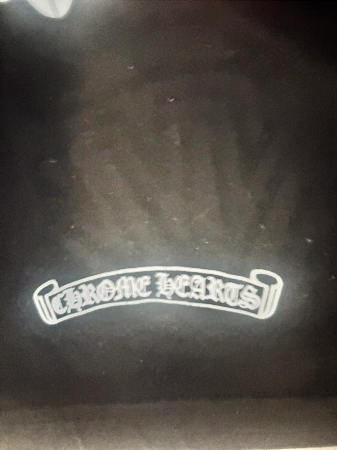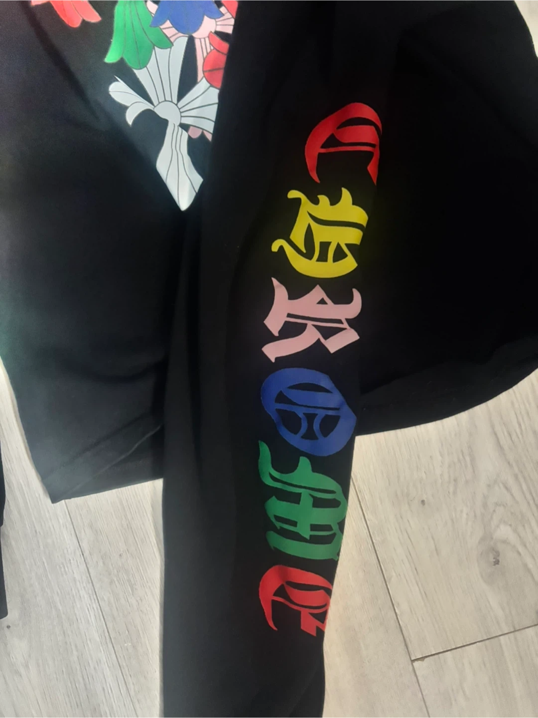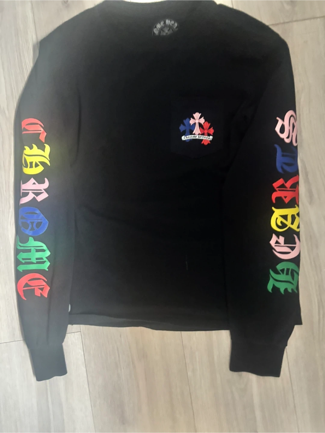 This is a black long sleeve shirt by Chrome Hearts. It features a multicolor cross graphic on the back and sleeve. The shirt is made of cotton.