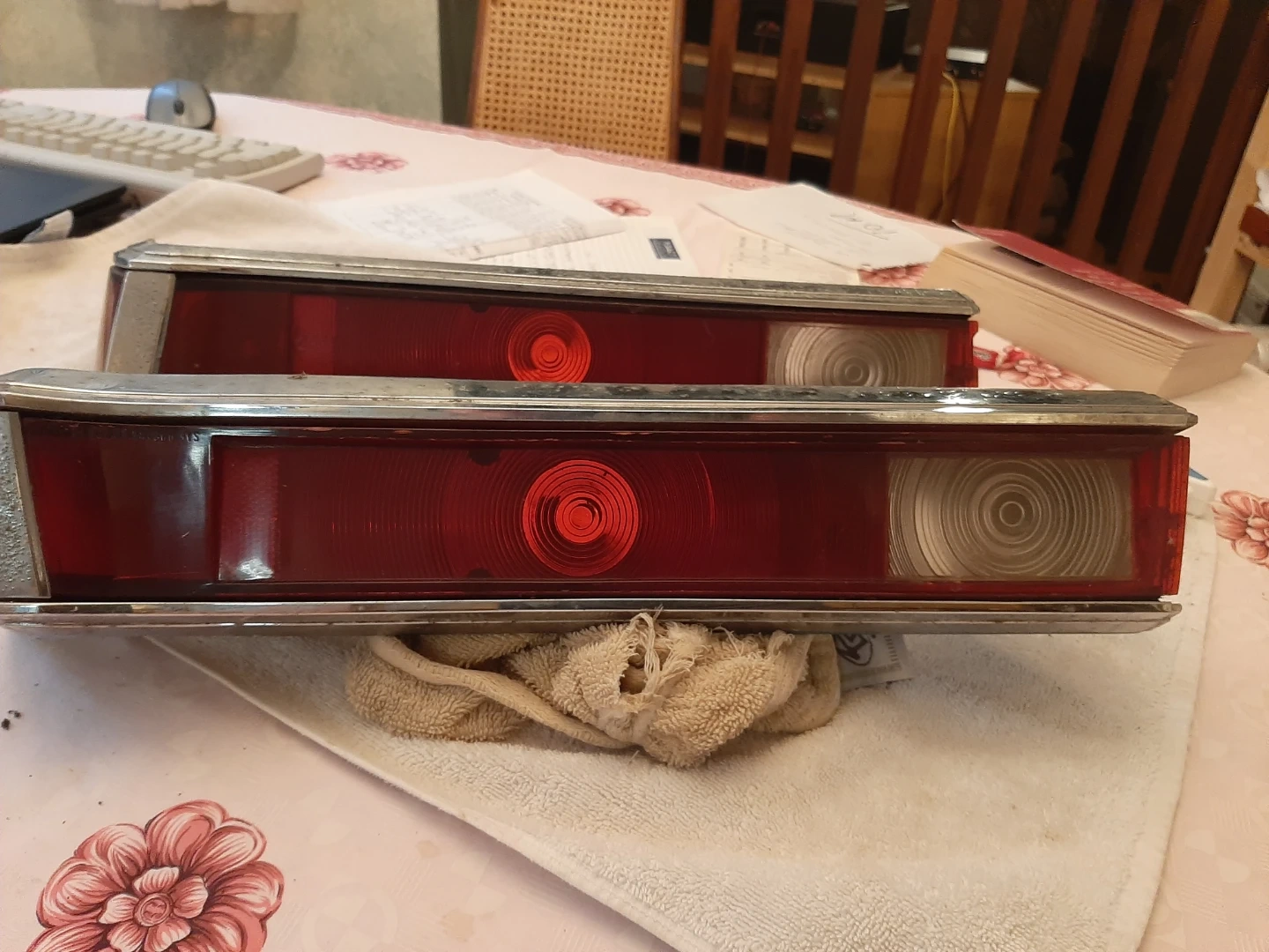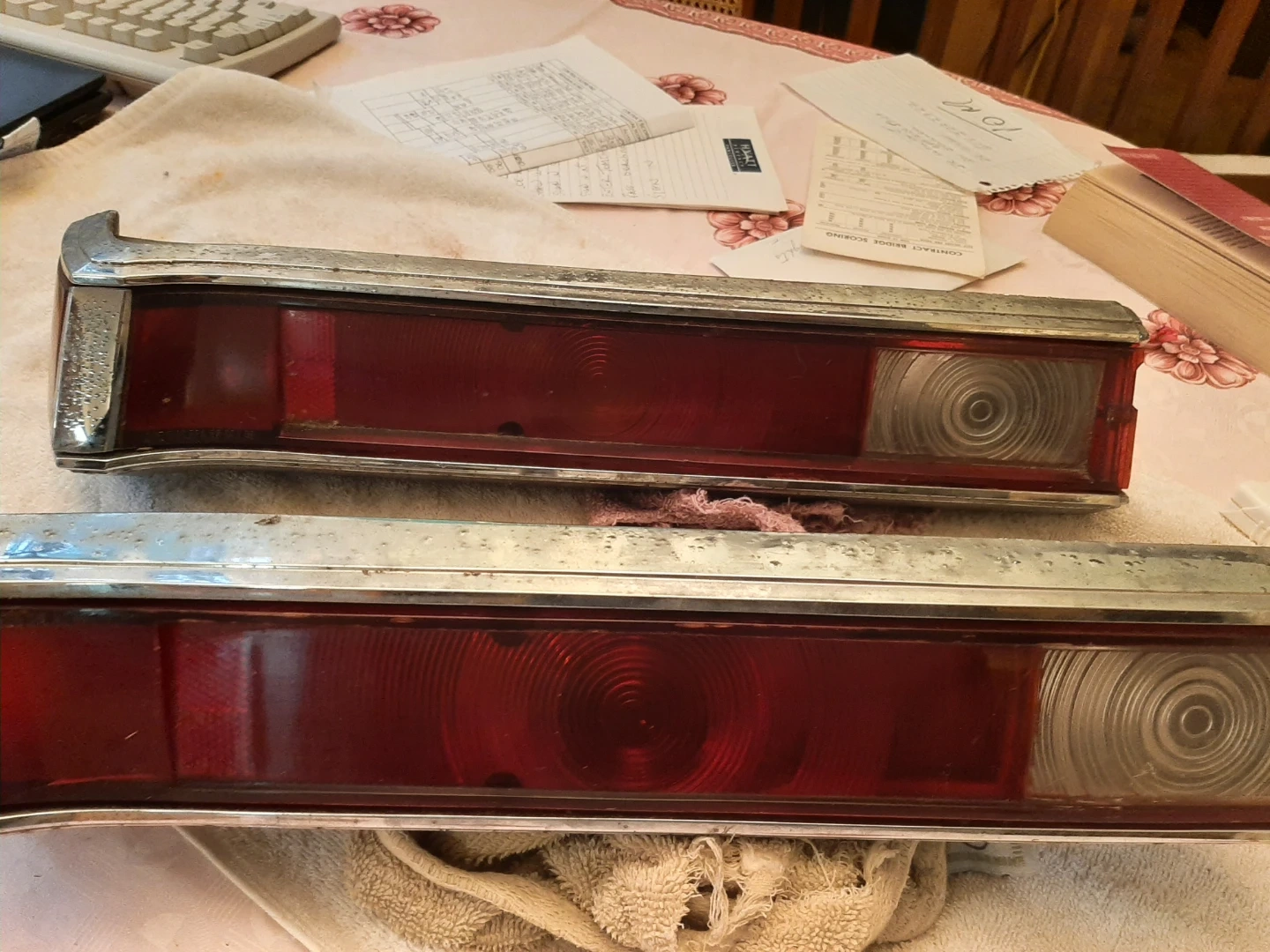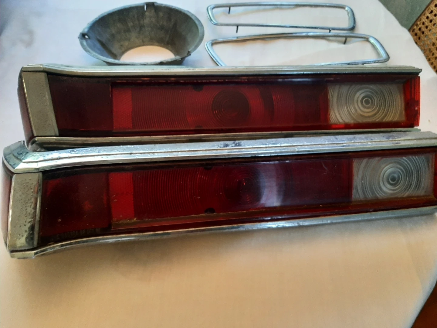 vintage car tail lights with chrome bezel. Red lense with clear reverse lens. original removed from car about 1979