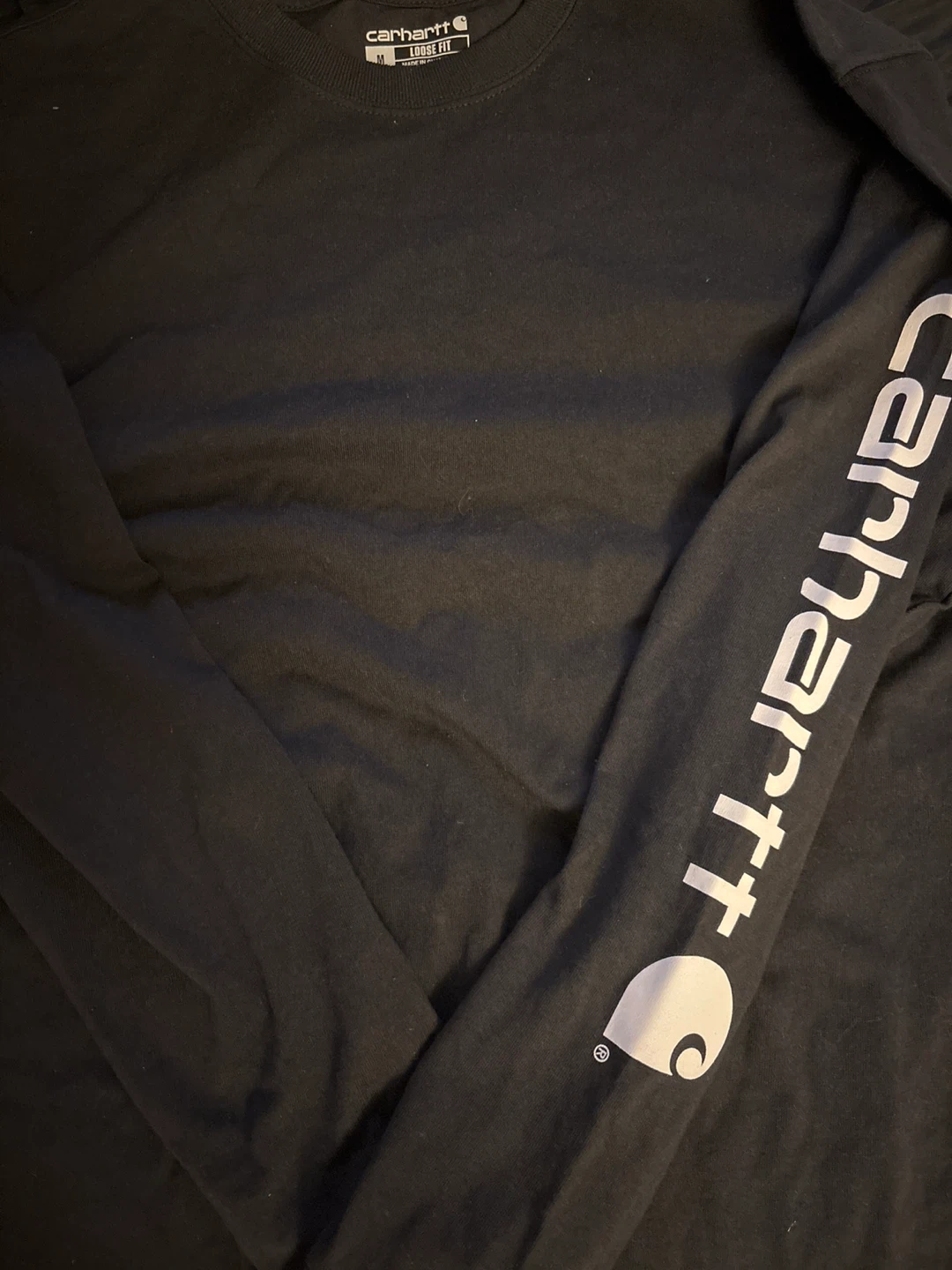 Selling a Carhartt black long sleeve shirt in size medium. It's in great condition and features the Carhartt logo on the sleeve. A comfortable and stylish addition to any wardrobe!
