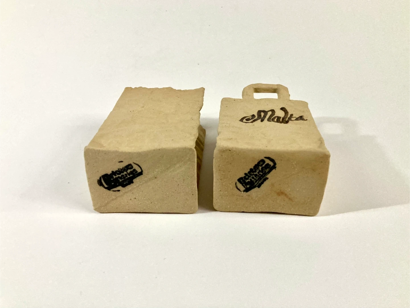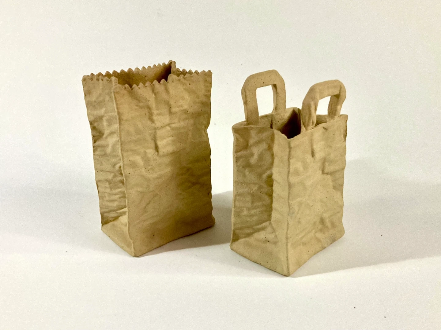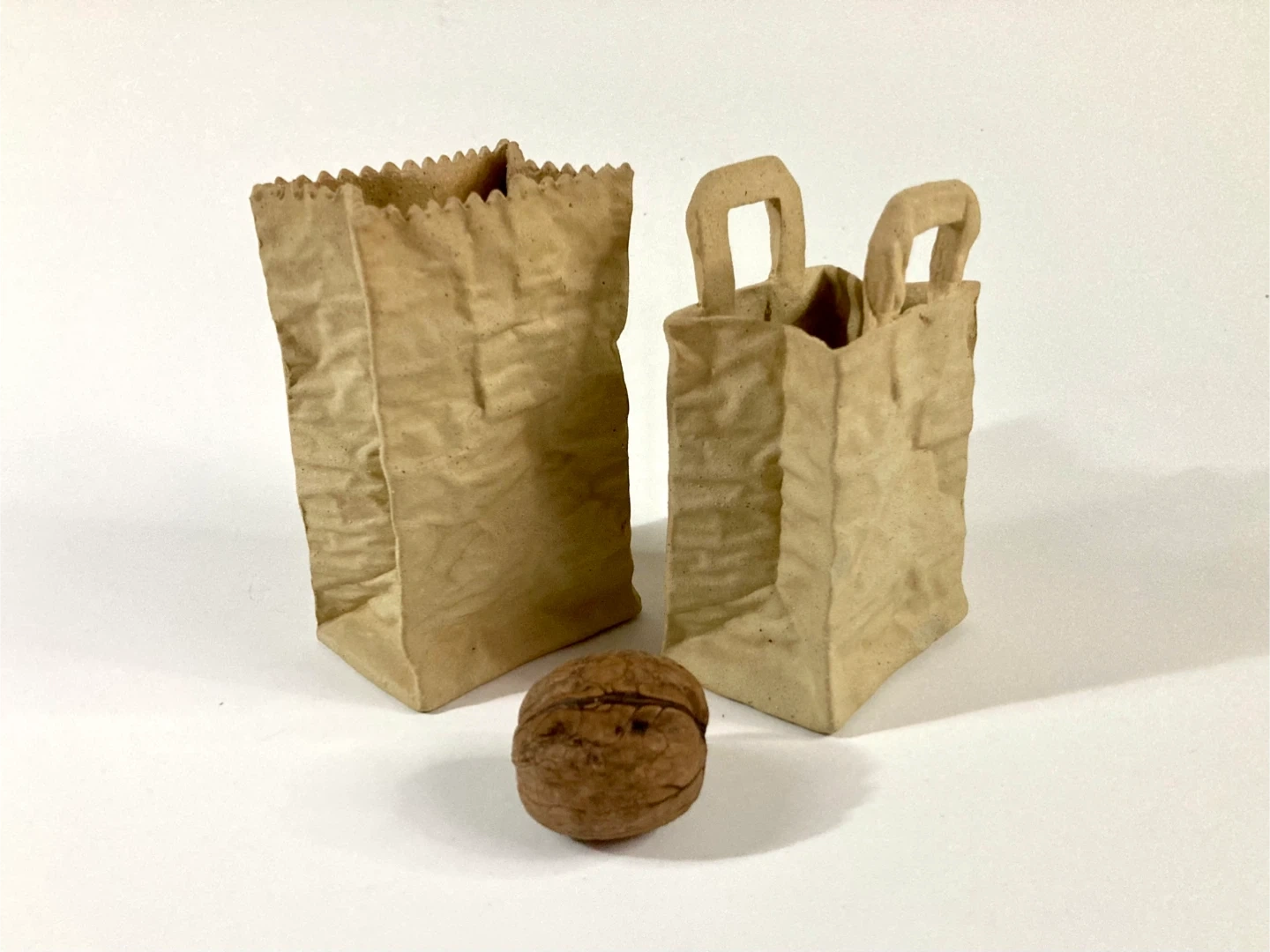 Cute ceramic vessels shaped like paper grocery bags with handles. Price is for the pair. Second picture includes a walnut to show scale.