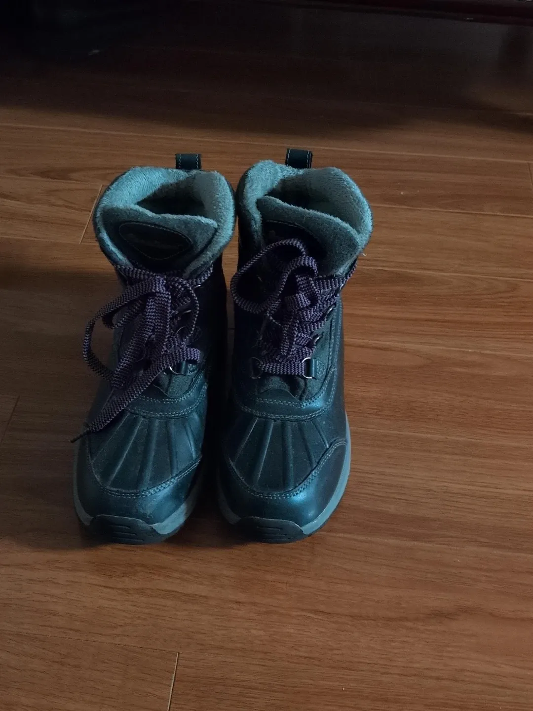 Warm and cozy winter boots with a fleece lining. They have a durable rubber sole and lace-up closure for a secure fit. Perfect for cold weather activities!