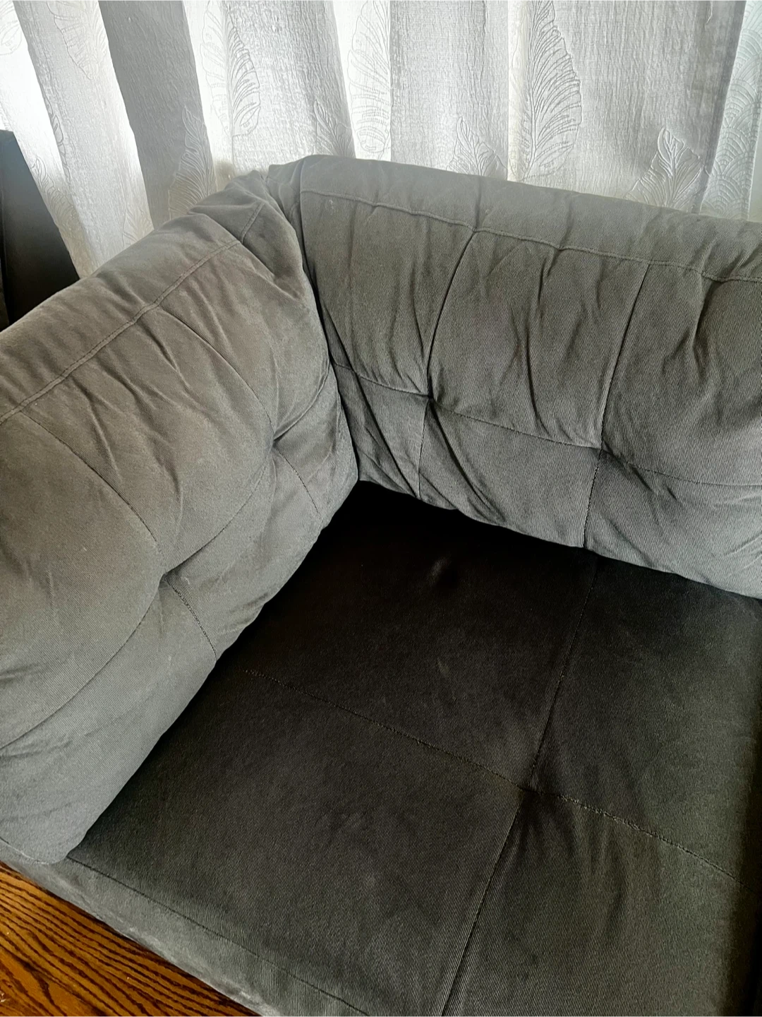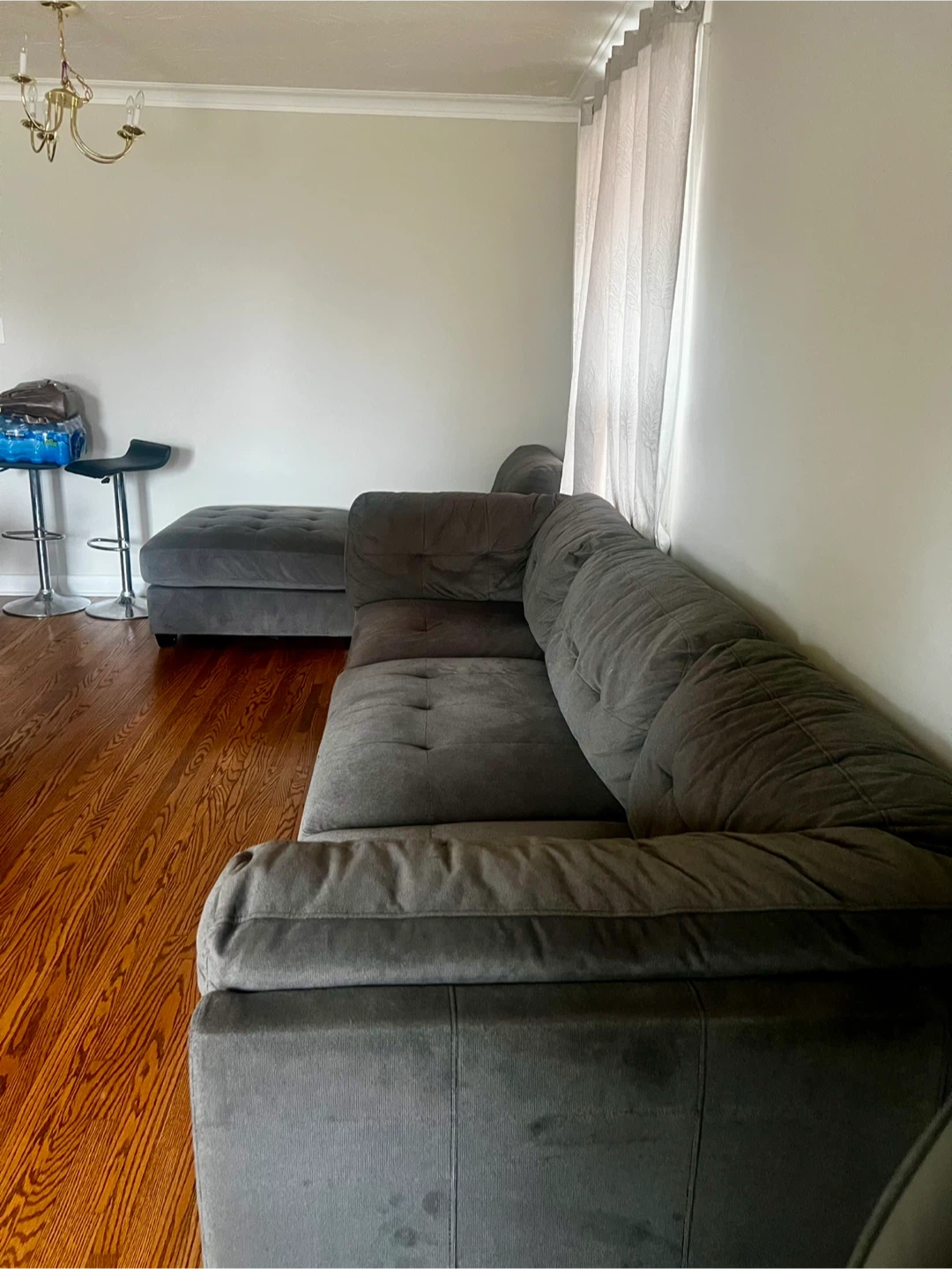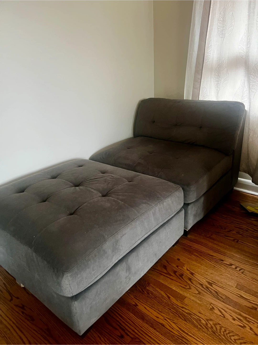 Comfortable soft dark grey sectional sofa with a chaise lounge. Upholstered in a soft fabric with tufted cushions. It's a modular piece that can be rearranged.