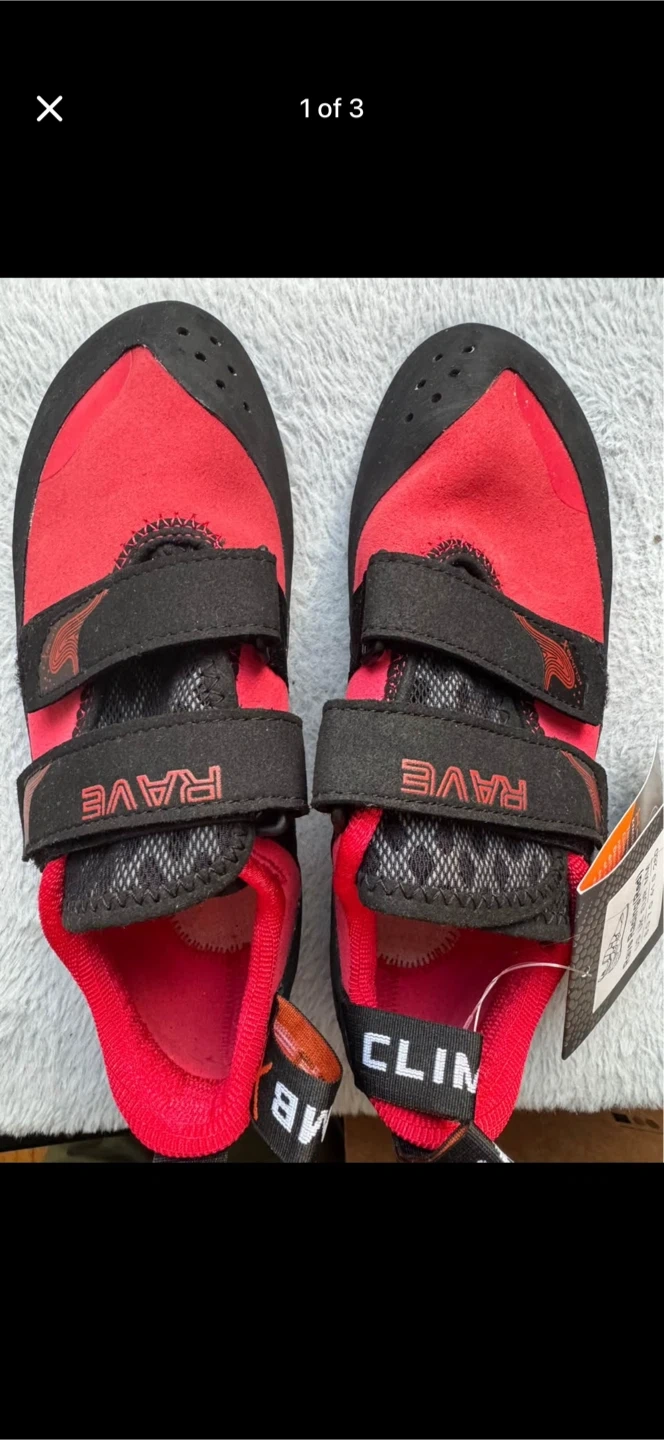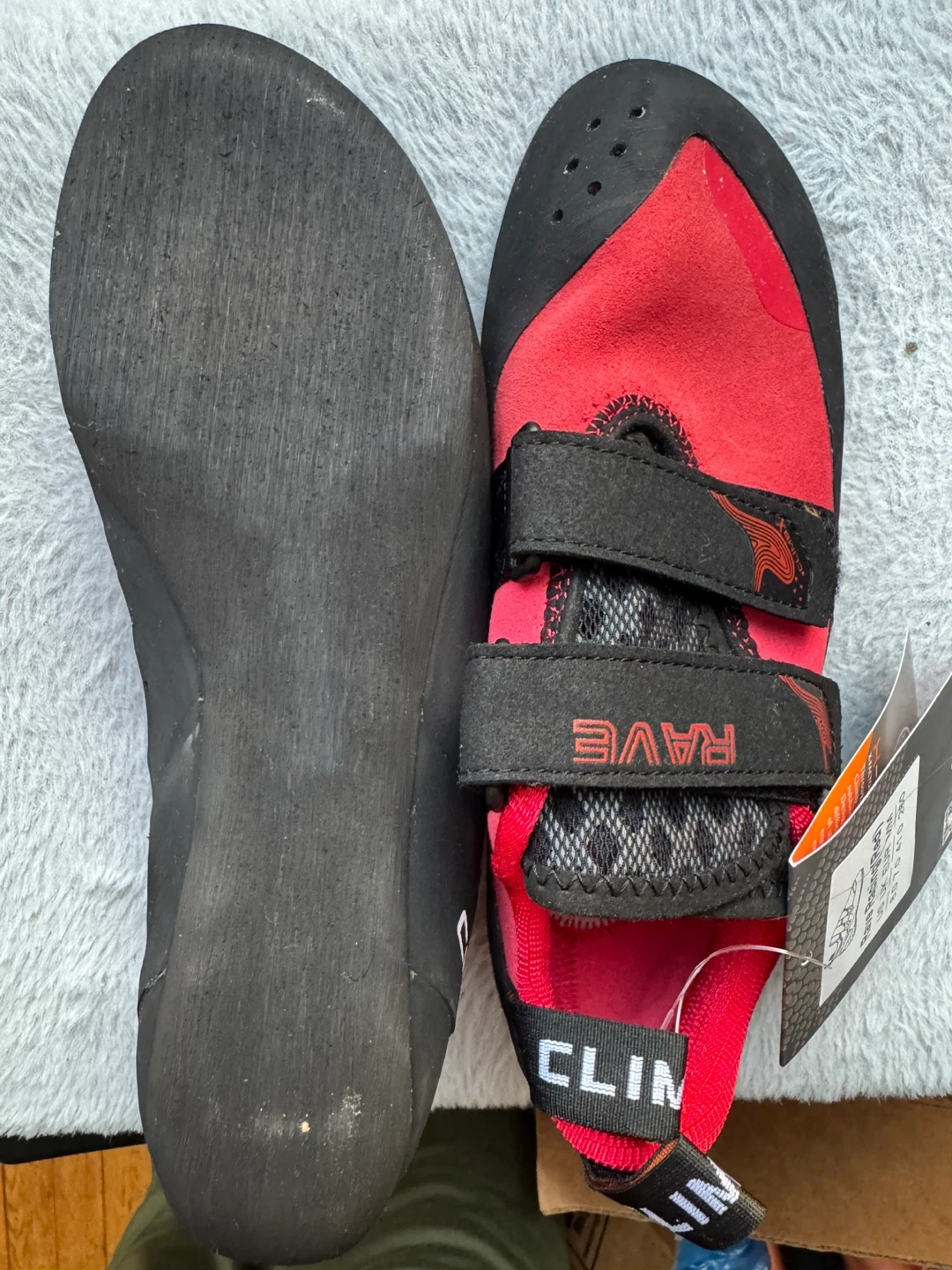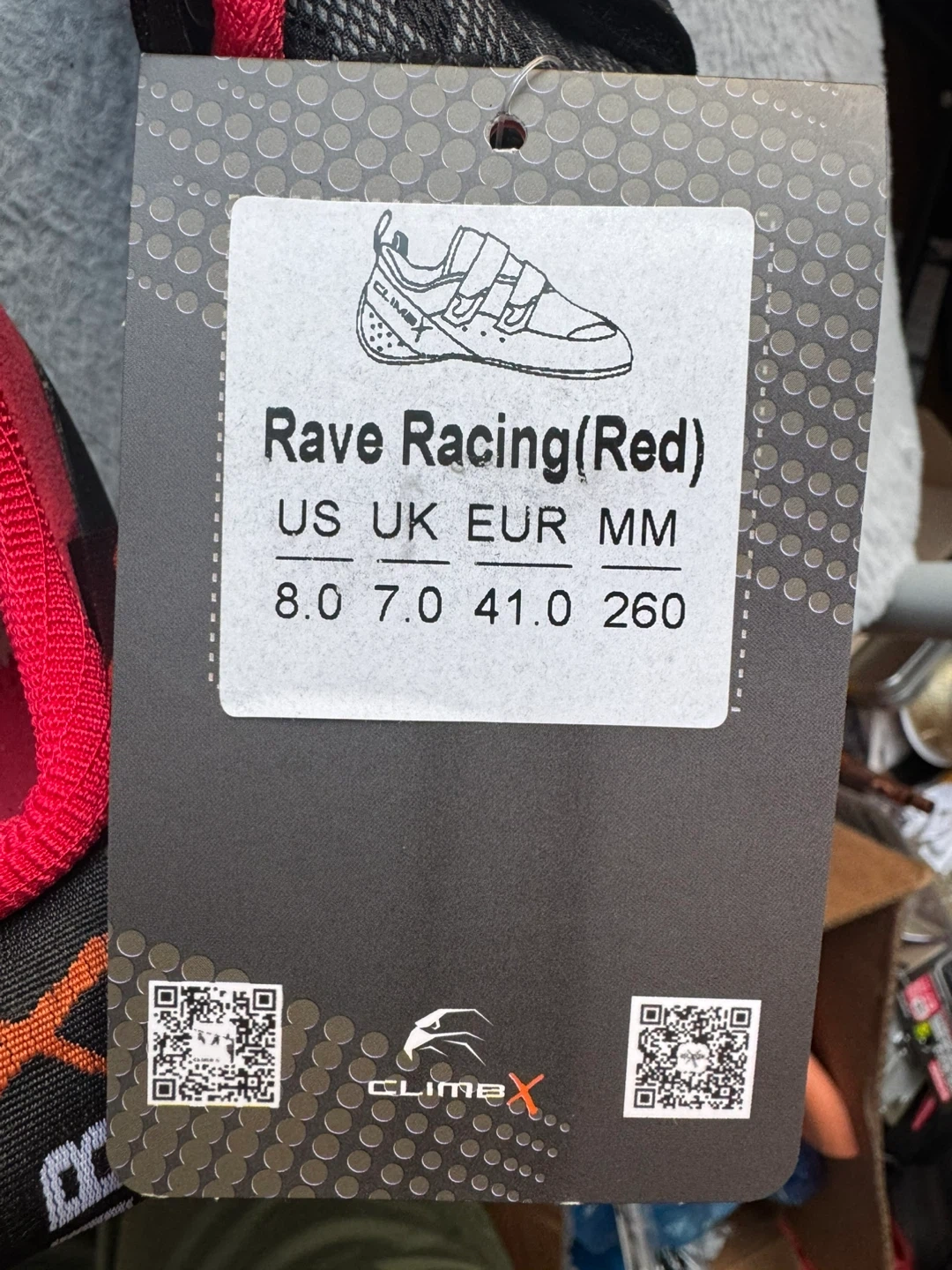 These red ClimbX Rave Racing climbing shoes are a size 8 US. They feature adjustable Velcro straps for a secure fit. The rubber sole offers good grip for bouldering or gym climbing. Pickup only. Cash payment at meetup. No shipping.