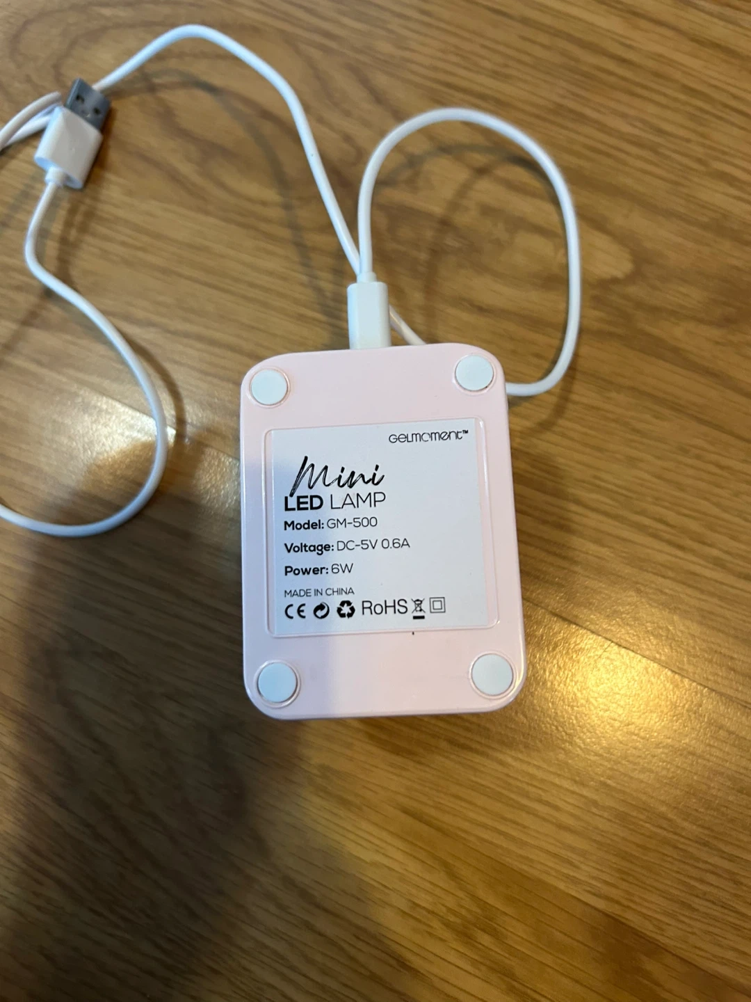 This is a GelMoment Mini LED Lamp, model GM-500. It's powered by DC-5V 0.6A and has a 6W output. Made in China.