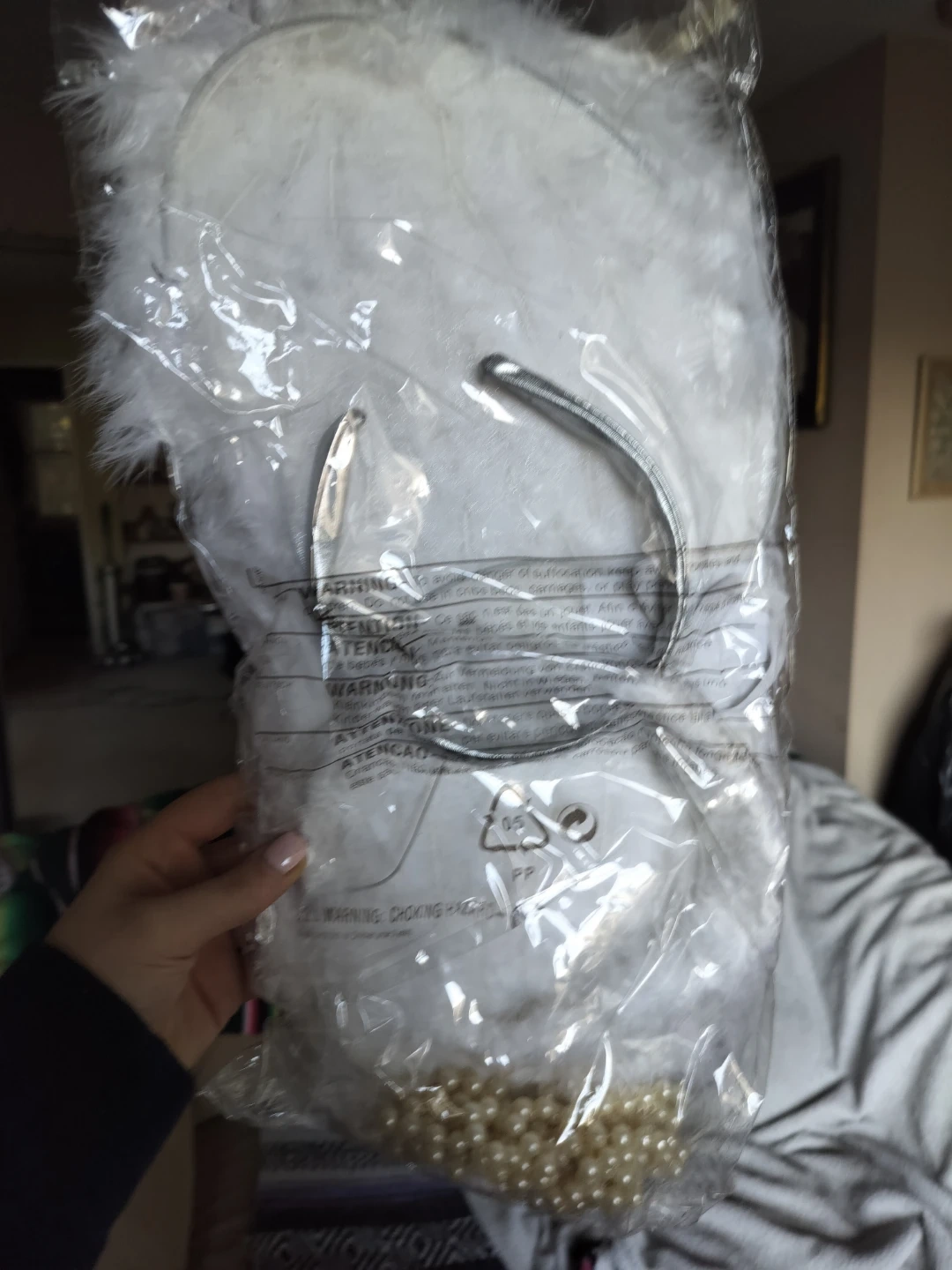 This is a white feather wings, halo and pearl necklace set. It's great for dress-up or parties! The set includes angel wings, halo with a silver headband and a pearl necklace. Great for Halloween or dress up parties.