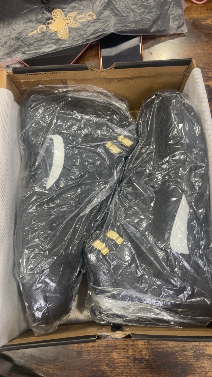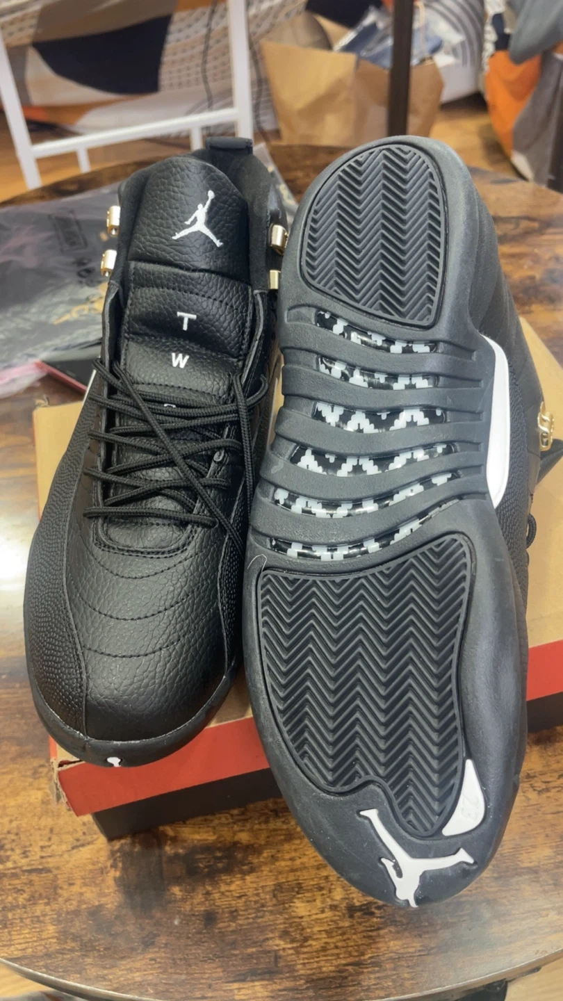 Air Jordan 12 Retro "The Master" sneakers in black and gold. Full leather upper with iconic Jumpman logo and gold accents. Comes with original box. Size 9, 12