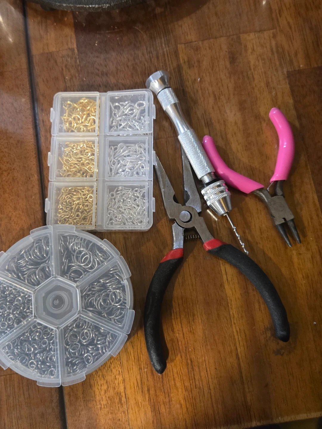 This set includes several types of jewelry-making pliers and assorted jump rings. It features a hand drill tool for making holes and two types of pliers: one with a flat tip and one with a rounded tip. The jump rings come in both gold and silver tones, organized in a small compartment box and a larger round organizer.