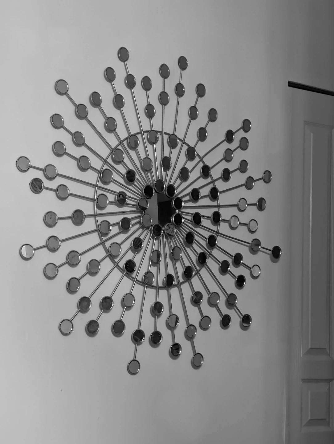 A decorative starburst wall art piece featuring a metal frame with numerous radiating spokes. Each spoke is tipped with a small, round mirrored accent. It's a striking piece that adds a touch of modern flair to any room.