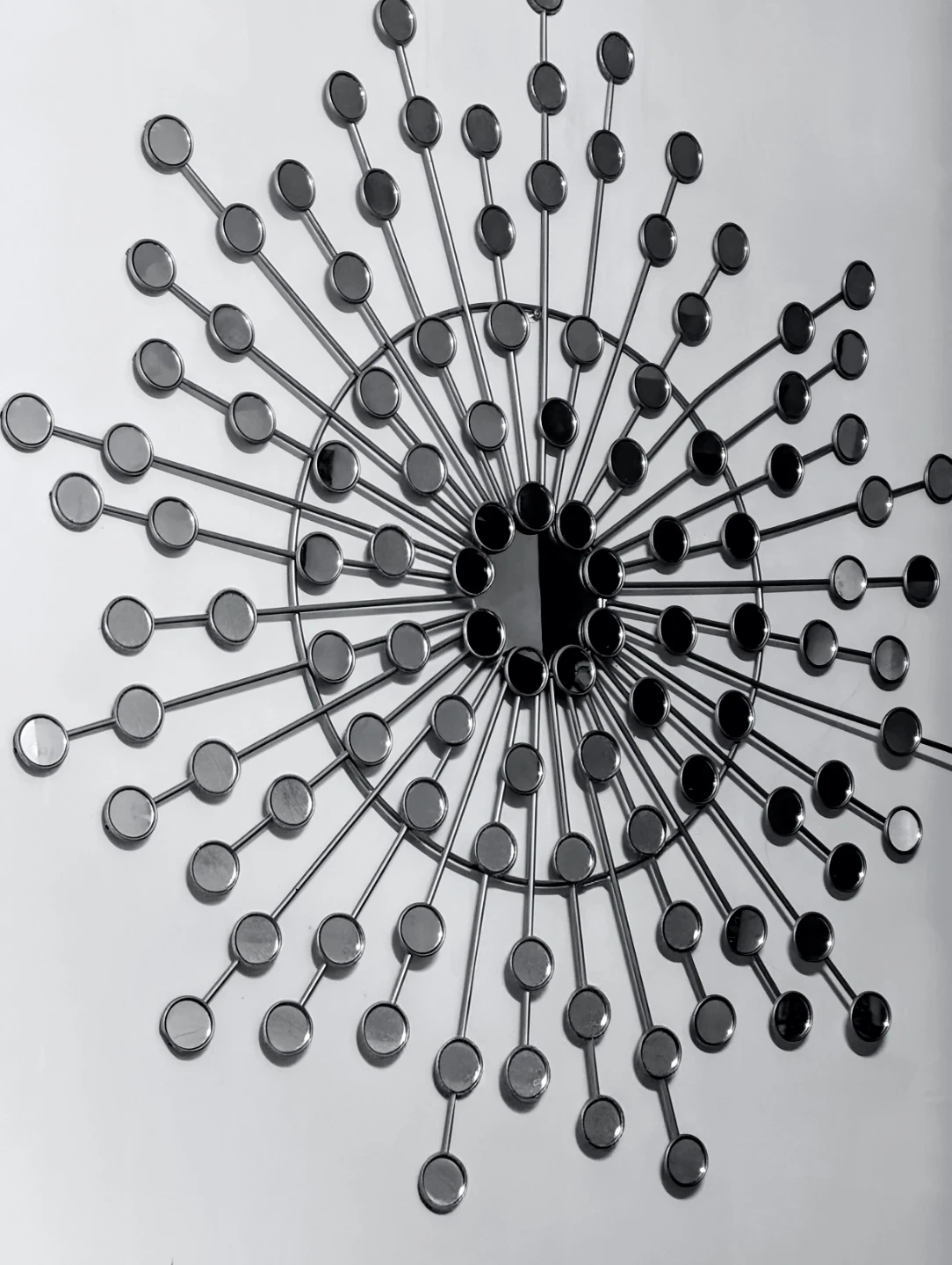 A decorative starburst wall art piece featuring a metal frame with numerous radiating spokes. Each spoke is tipped with a small, round mirrored accent. It's a striking piece that adds a touch of modern flair to any room.