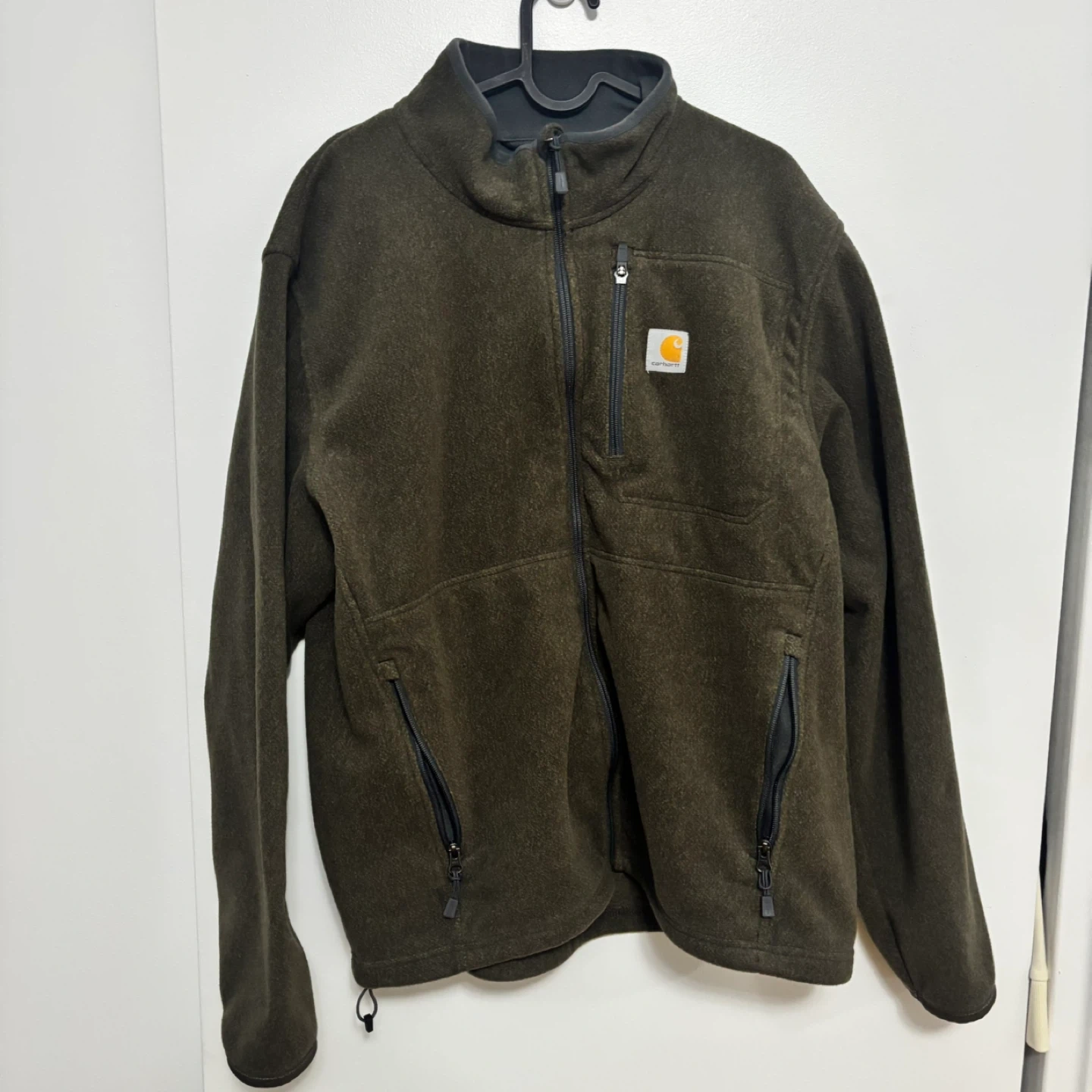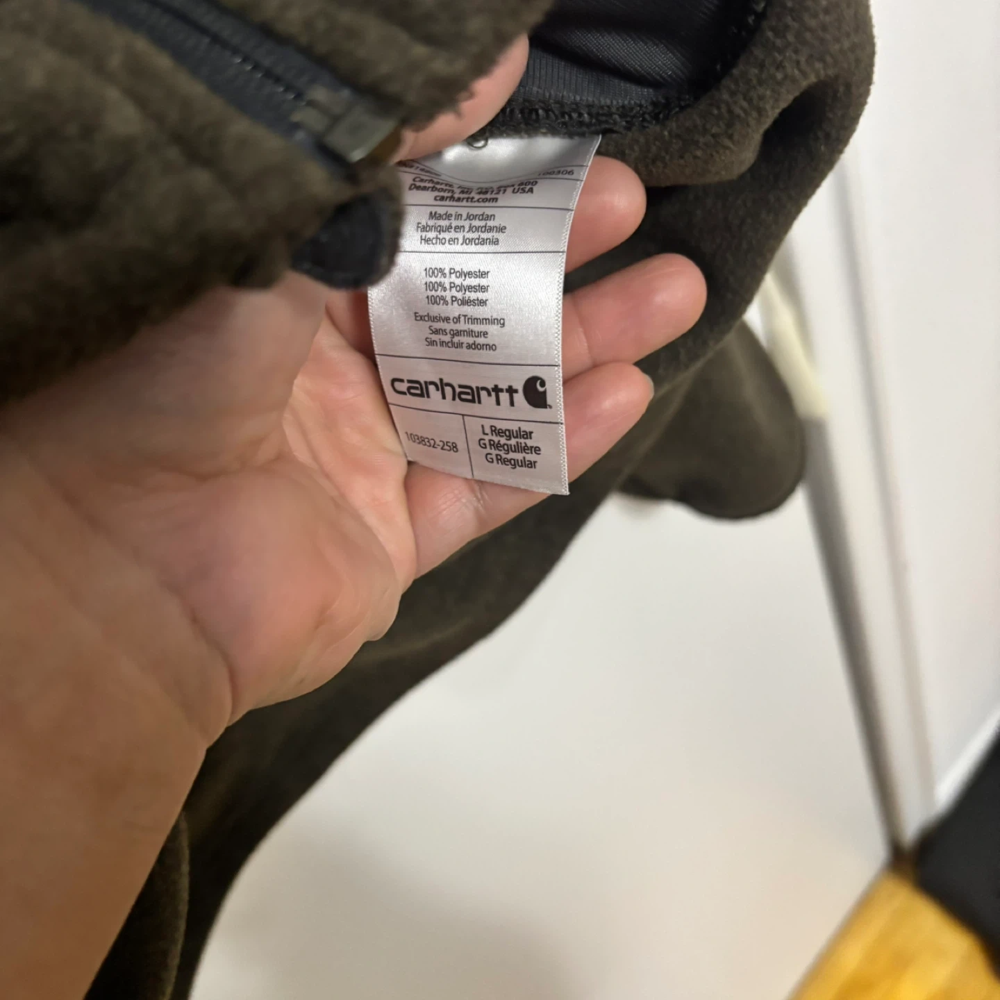This Carhartt fleece jacket is made of 100% polyester. It's a regular size large in a dark olive green colour. It has a full zip front and zippered pockets.