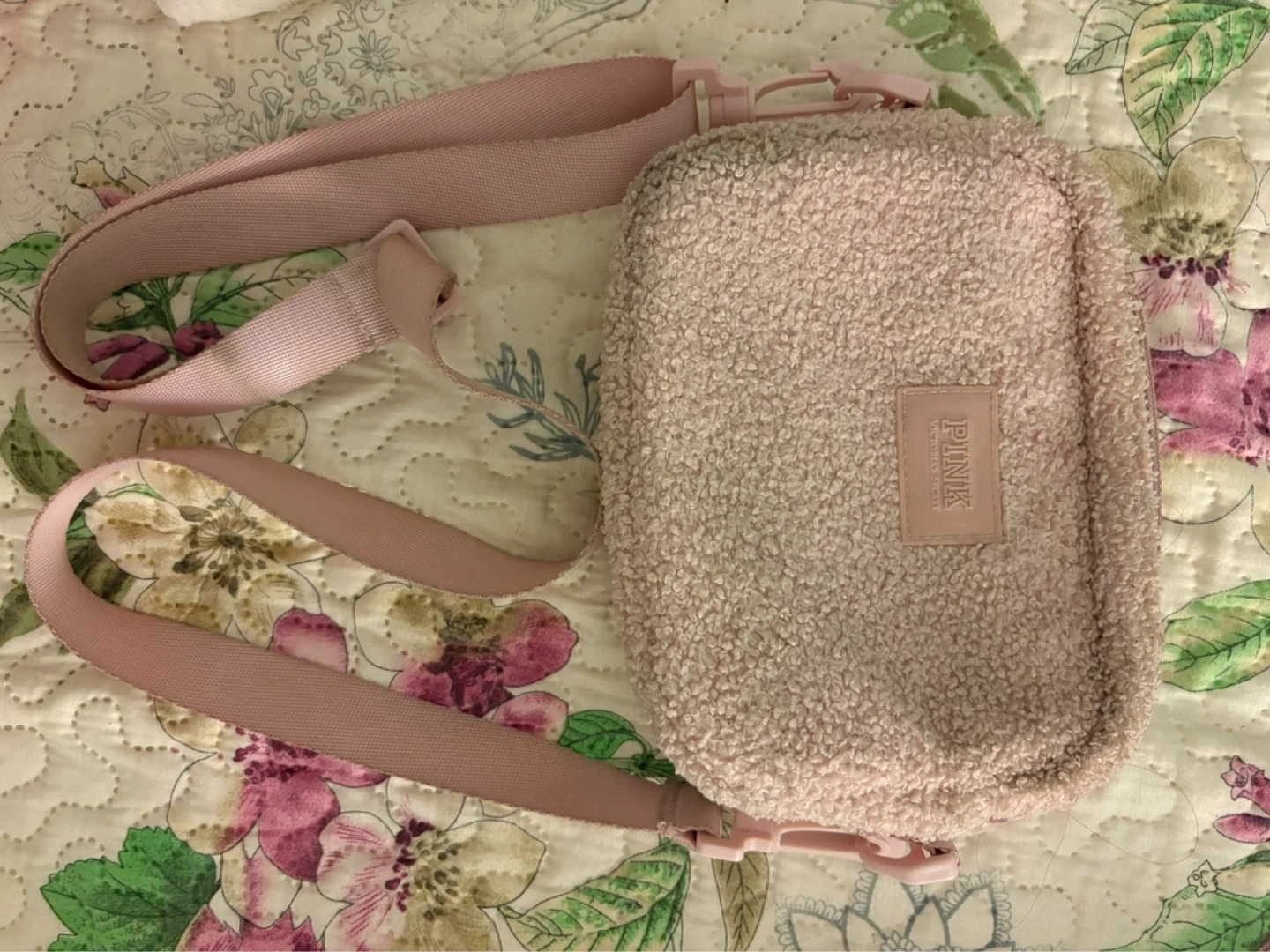This is a fuzzy pink sherpa crossbody bag from Victoria's Secret PINK. It has an adjustable strap and a zippered main compartment. Perfect for carrying your essentials!