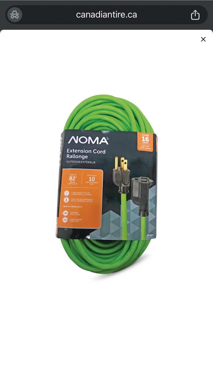 NOMA outdoor extension cord 82 feet long and rated for 16 gauge. It's a 10 amp, 125 volt cord with a grounded outlet. It's built for outdoor use, perfect for lawn equipment like mowers. Never used, my dog ripped off a little bit of the packaging but actual cable is fine