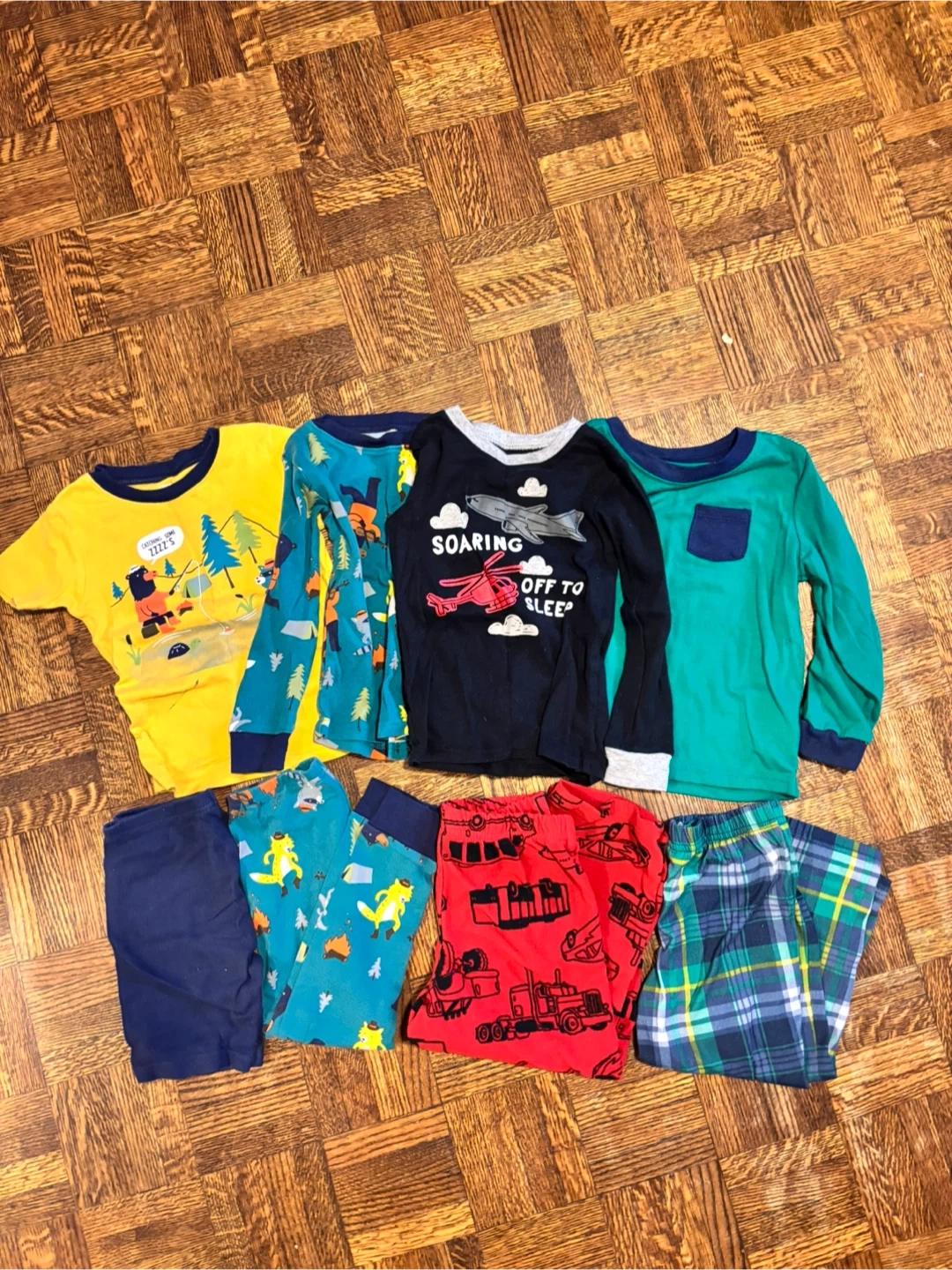 Here's a set of gently used kids' pajamas, perfect for a cozy night's sleep! There are four tops and four bottoms with different colours and patterns. Price includes all four sets