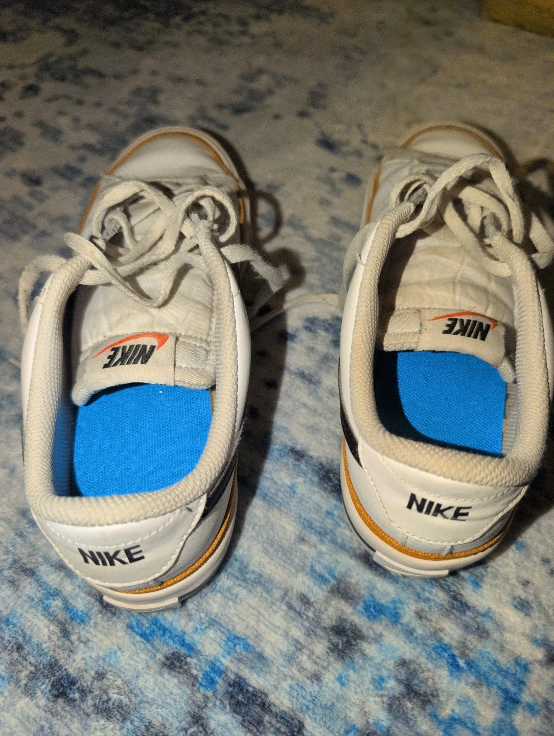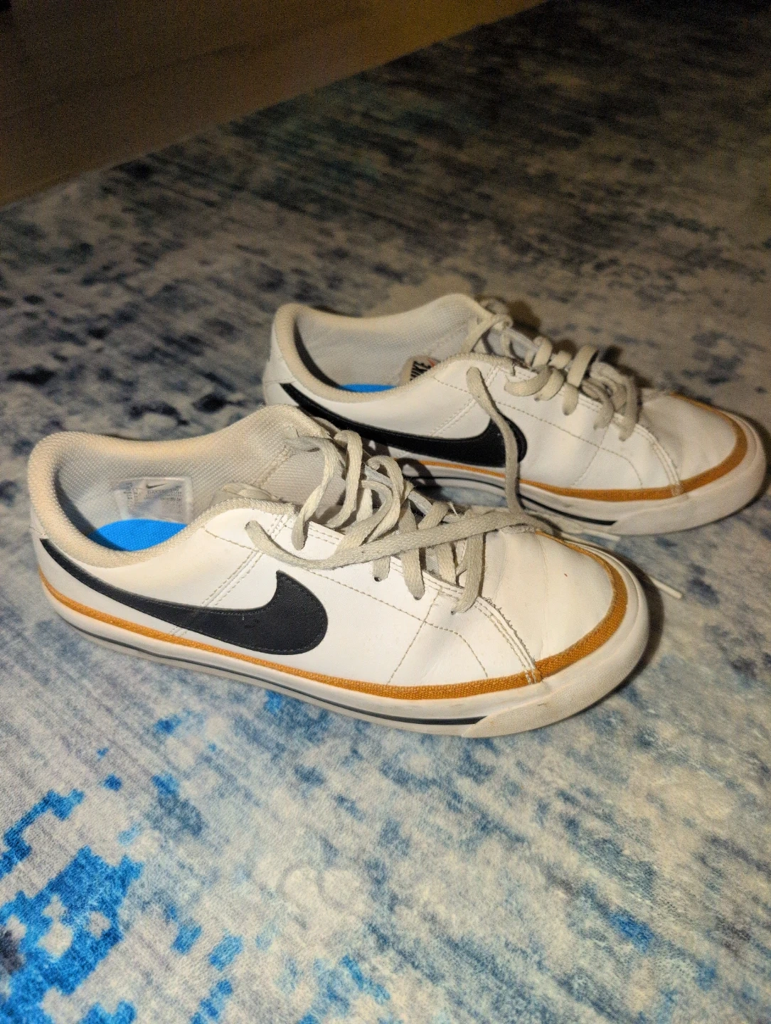 These are a pair of white boys' size 6Y genuine Nike sneakers with black and orange accents. They feature a classic lace-up design. These kicks are great for everyday wear or indoor recess! The soles are brand new inside because the original ones wore out.