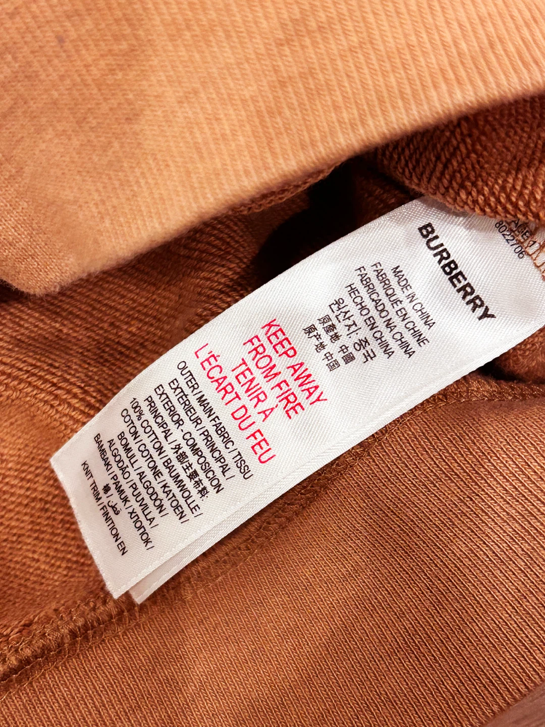 This Burberry kids' sweater is in great condition and ready for a new home! It's a brown and white striped sweater with "BURBERRY LONDON ENGLAND" in orange lettering across the chest. The size is 2Y (92cm). Super cute and comfy for your little one!