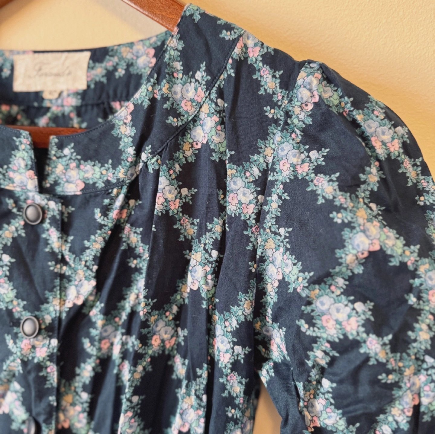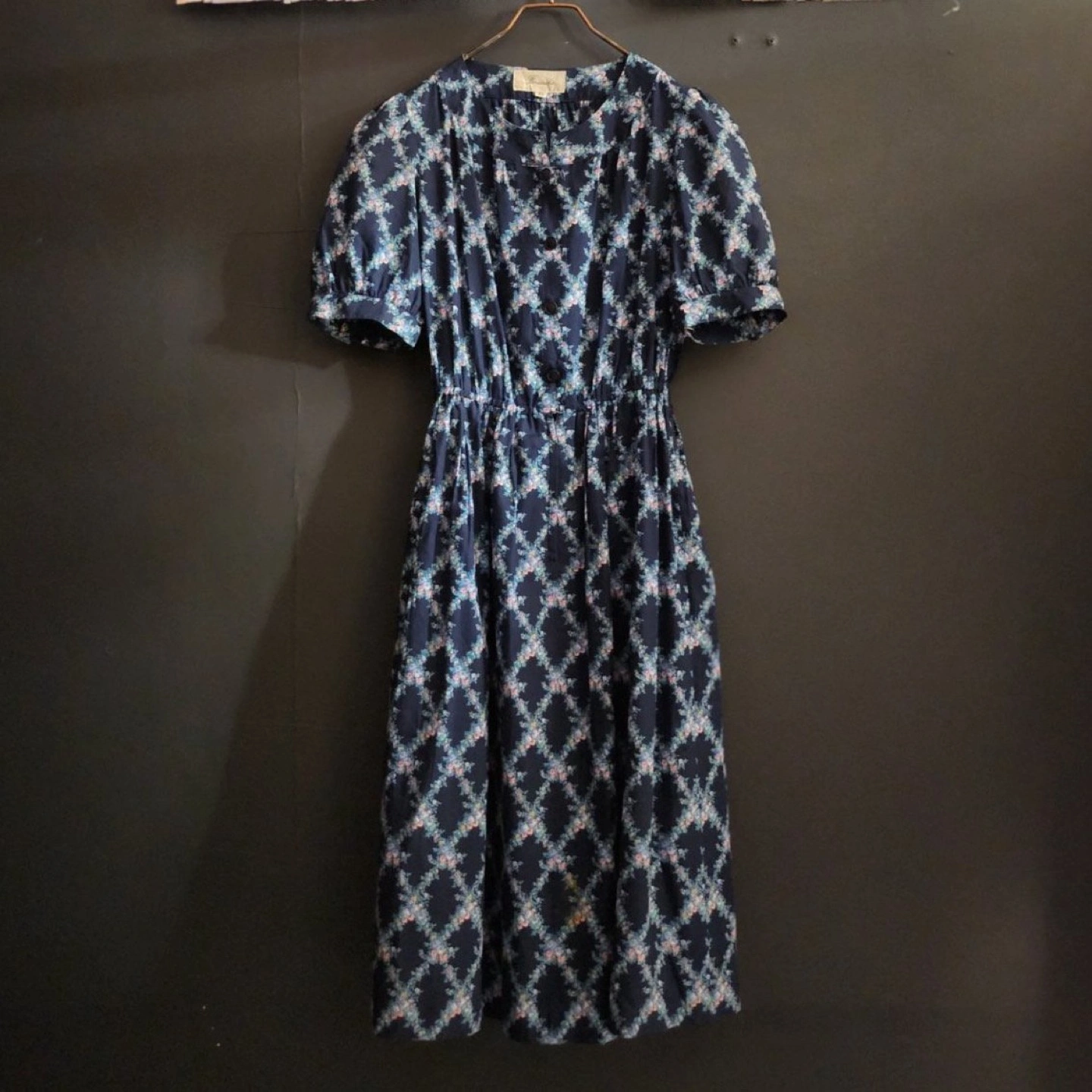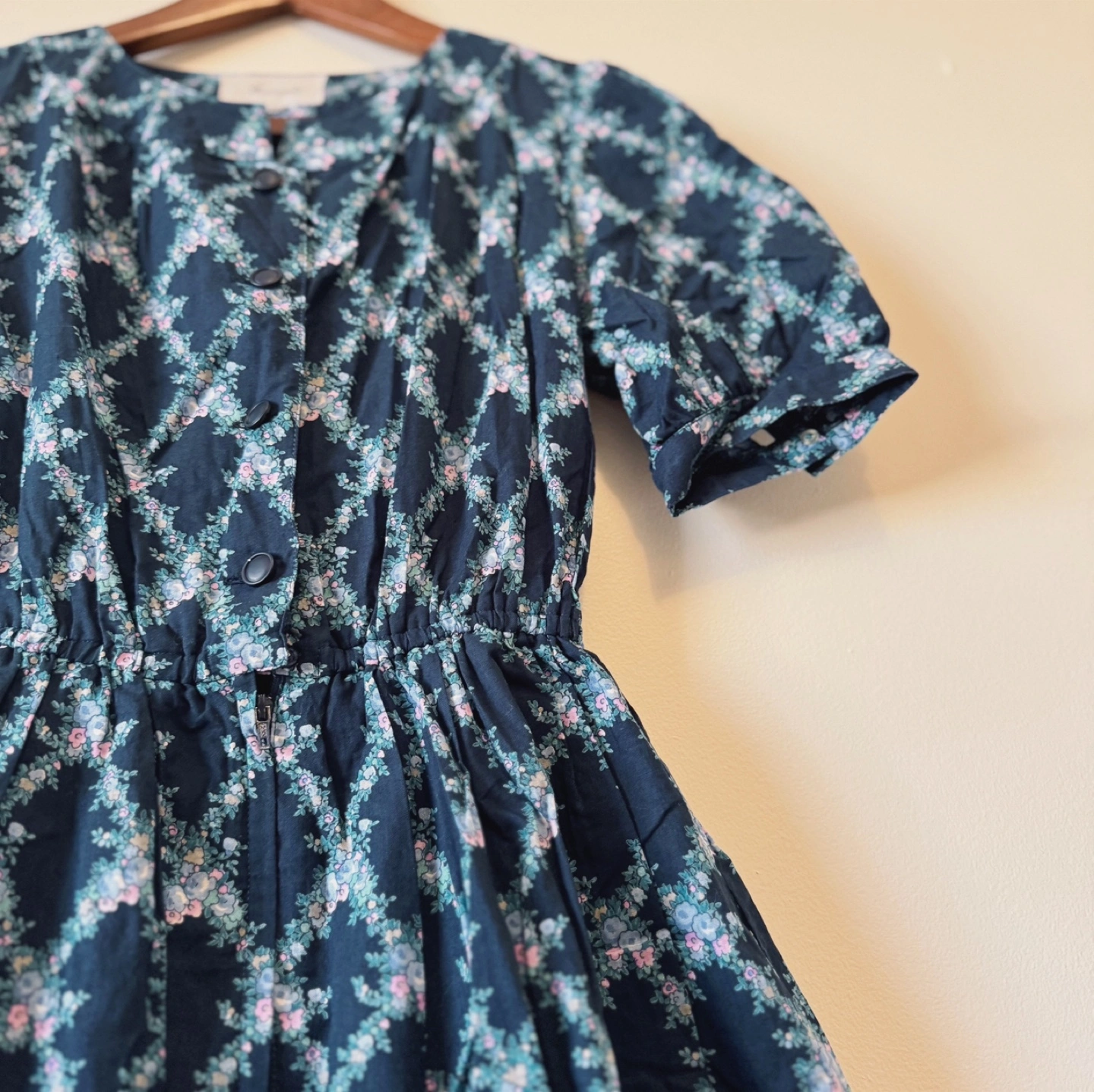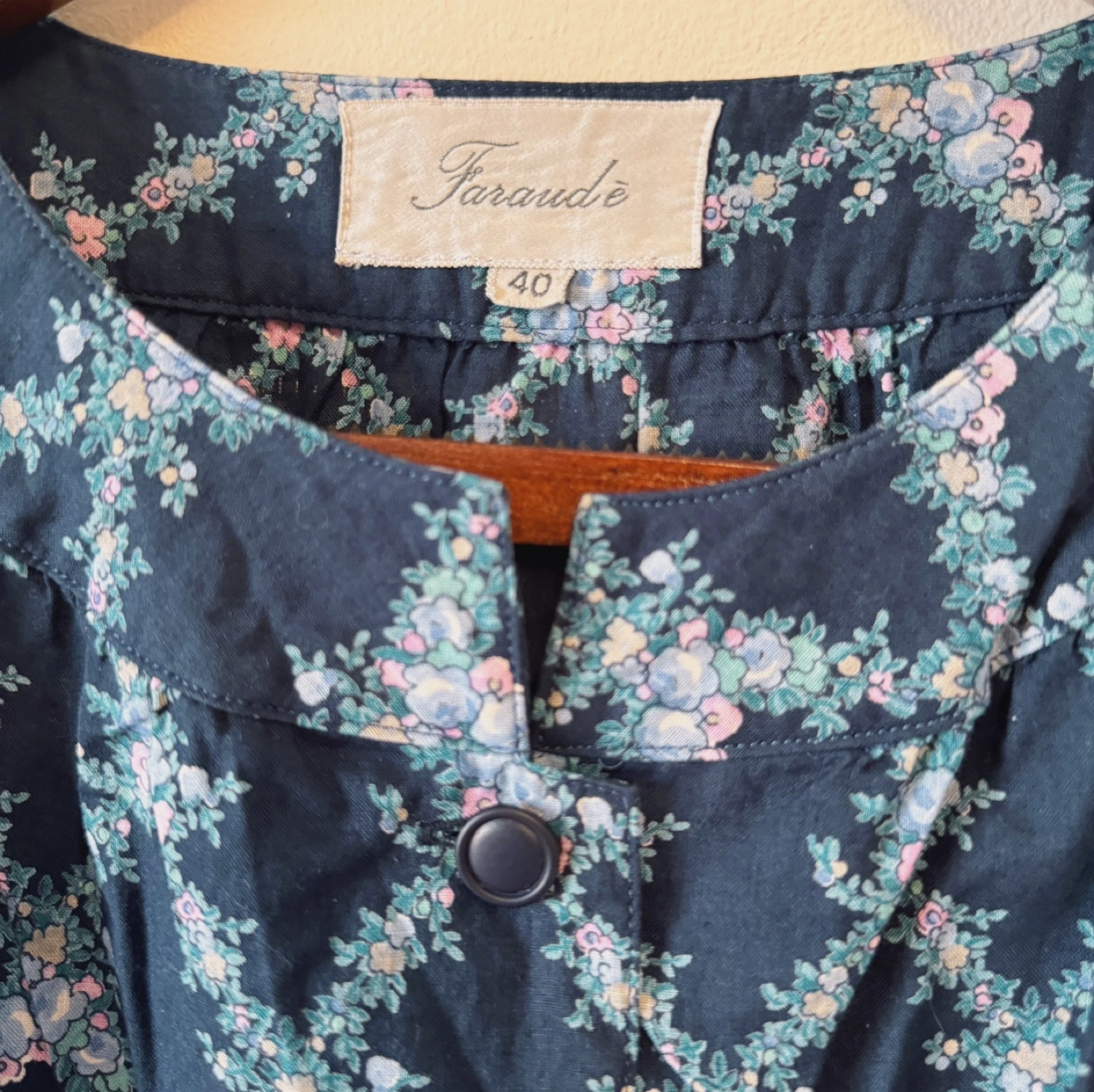 A charming vintage dress by Faraudé, featuring a dainty floral print on a deep navy background. The puff sleeves and gentle gathers at the waist give it a romantic, classic silhouette. With a partial button front and full lining, this piece is both comfortable and elegant – ideal for garden parties or everyday grace.