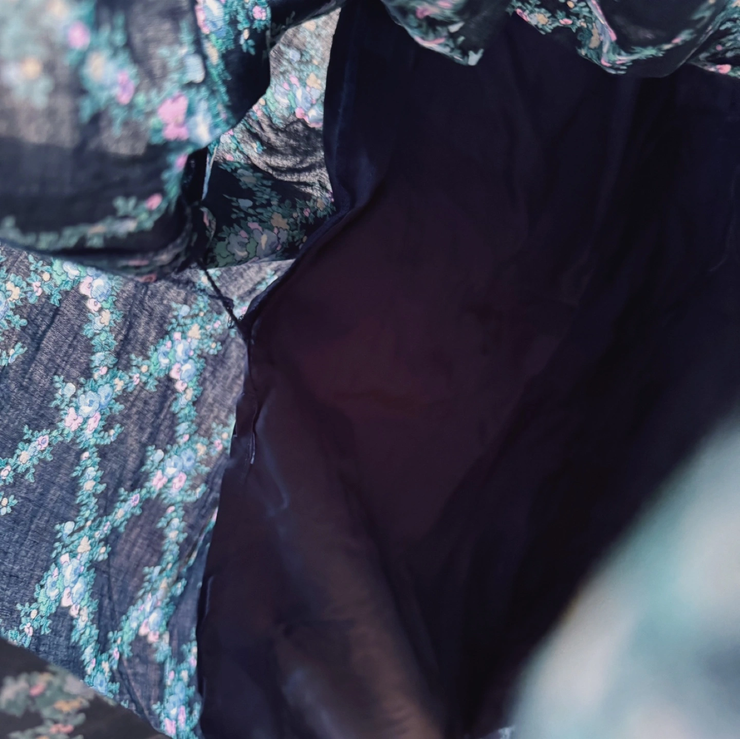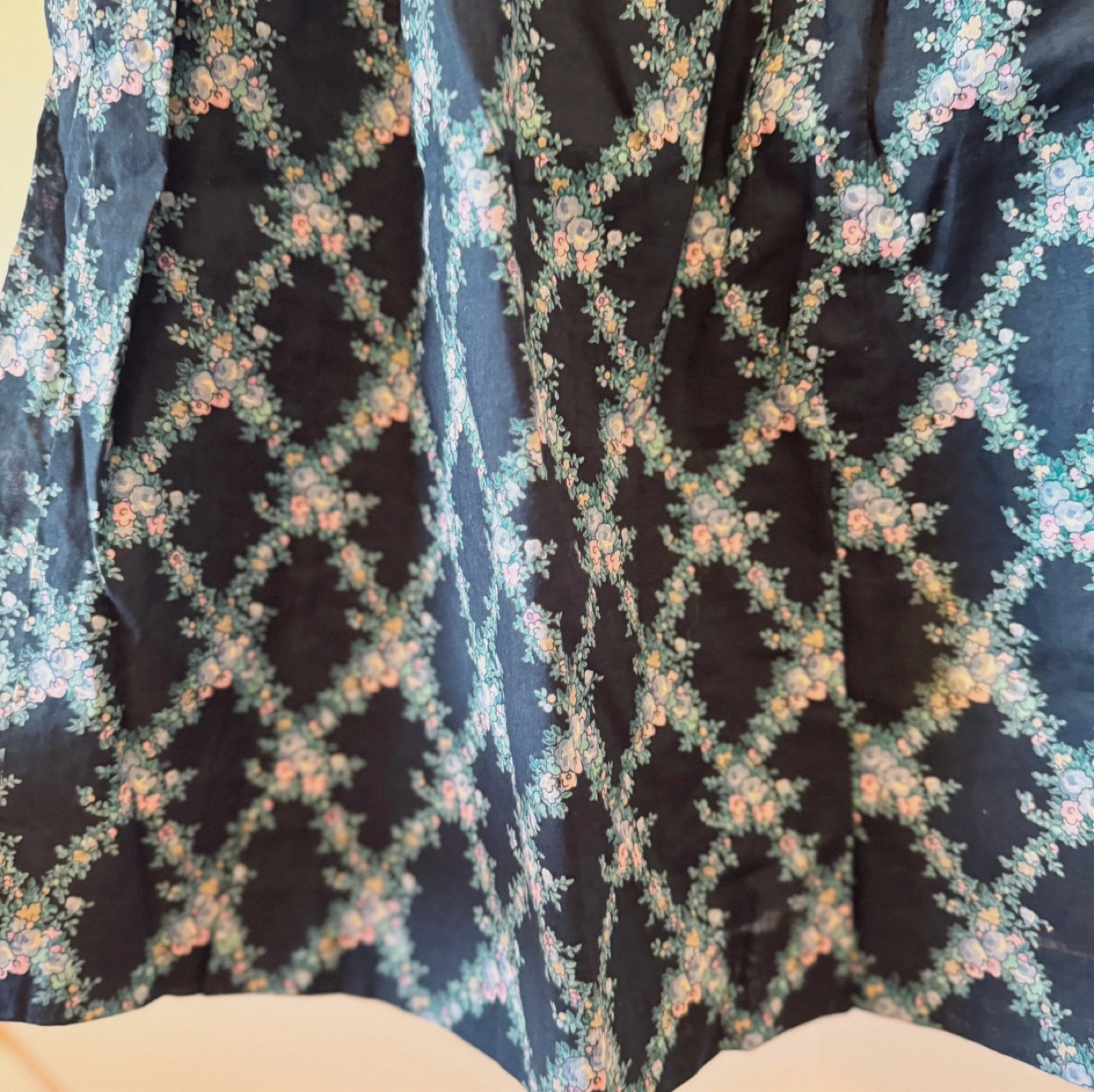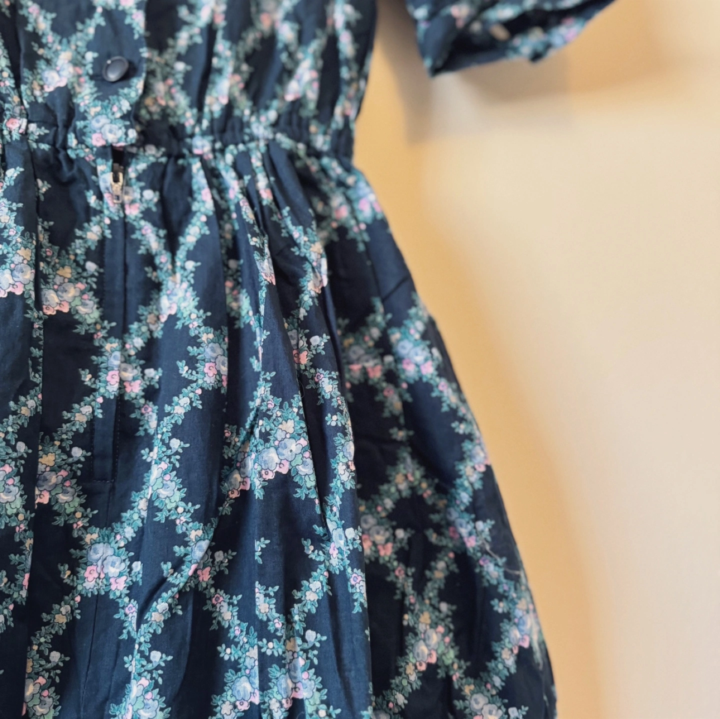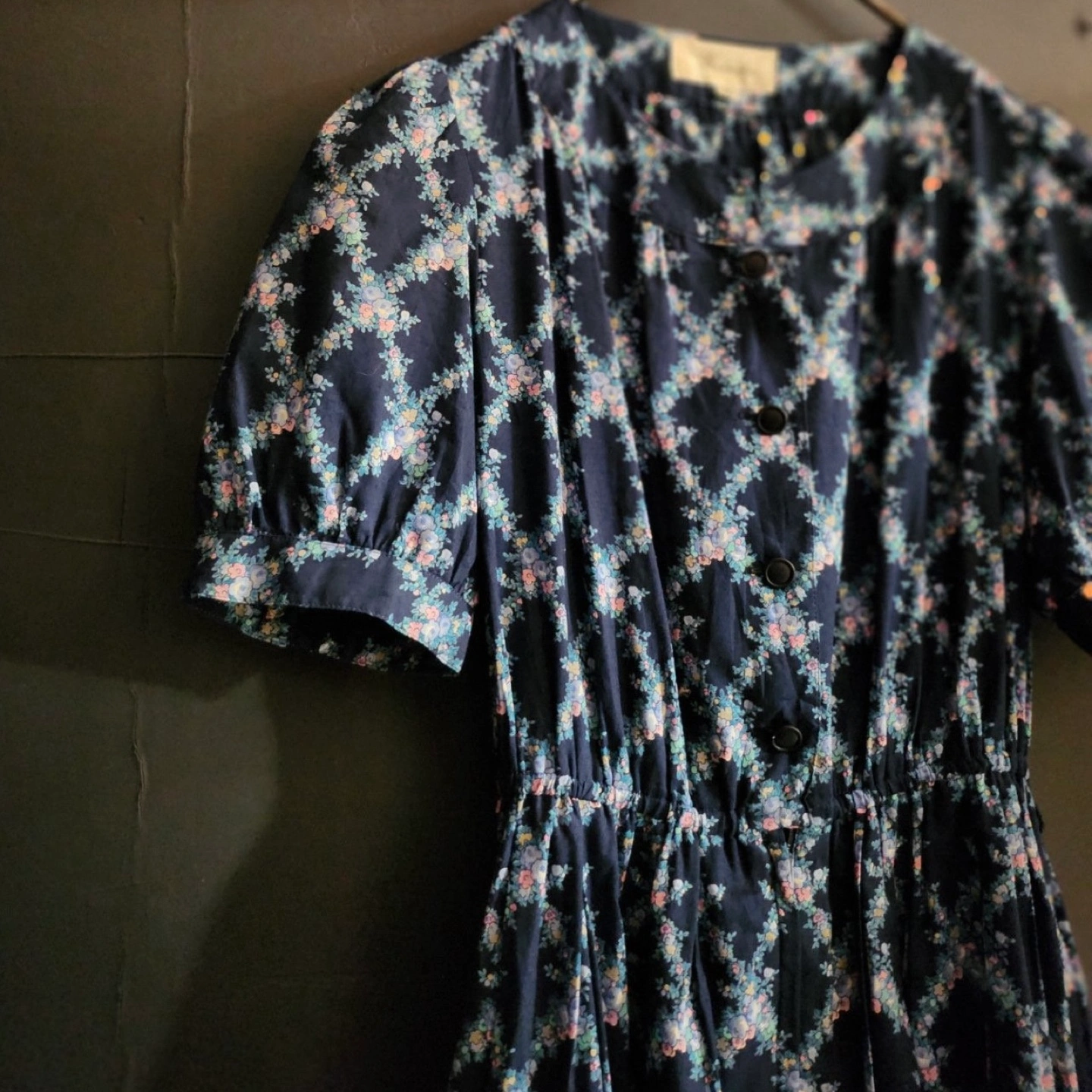 A charming vintage dress by Faraudé, featuring a dainty floral print on a deep navy background. The puff sleeves and gentle gathers at the waist give it a romantic, classic silhouette. With a partial button front and full lining, this piece is both comfortable and elegant – ideal for garden parties or everyday grace.