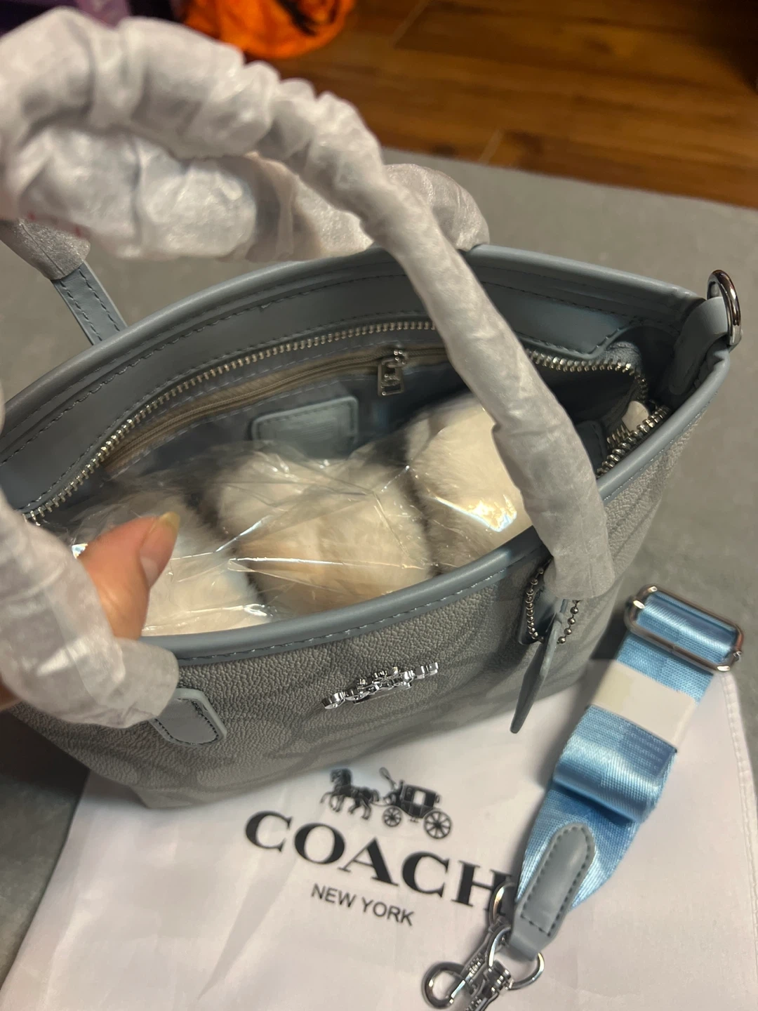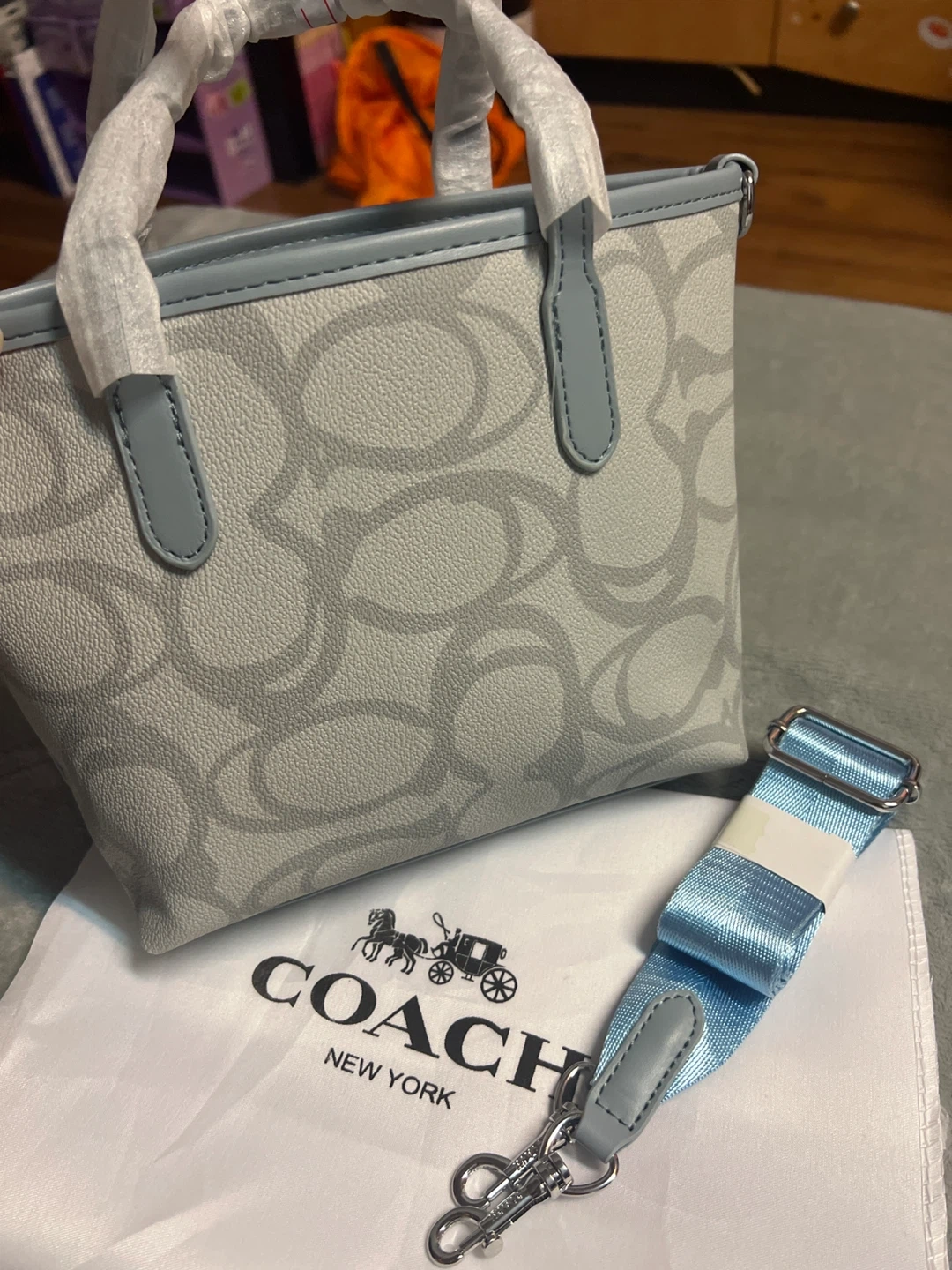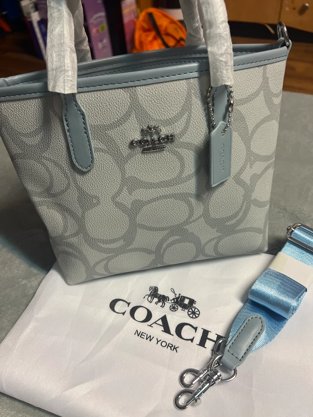 This COACH Willow Tote bag is a stylish accessory. It comes with a dust bag and a detachable strap. The exterior features the signature COACH 'C' pattern.